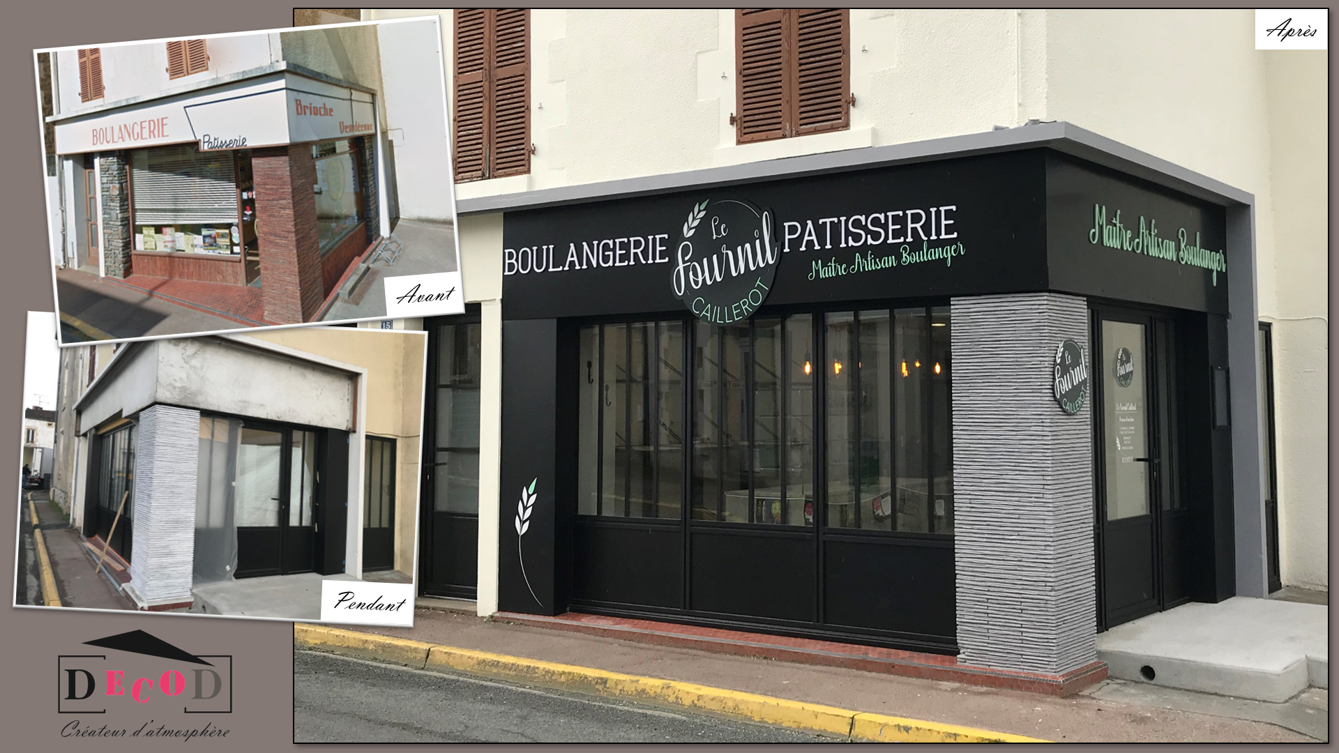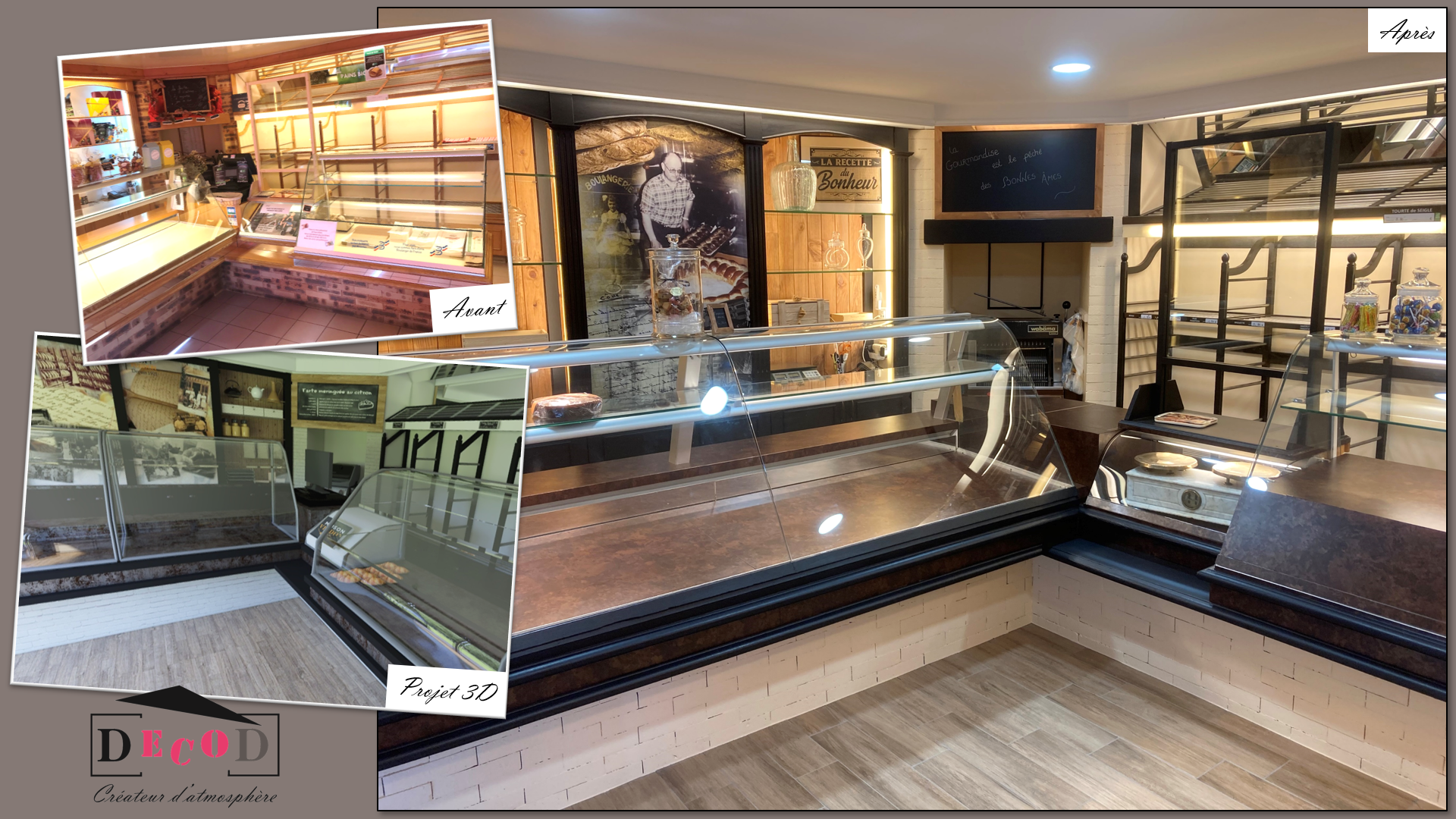 DecoD a imaginé un relooking de cette boulangerie sans remplacement du mobilier existant. Seul le sol a été changé. Pour tout le reste, il ne s’agit que de peinture, adhésif et accessoirisation. Les vues 3D réalisées en amont des travaux ont permis aux clients de valider le projet en toute confiance.