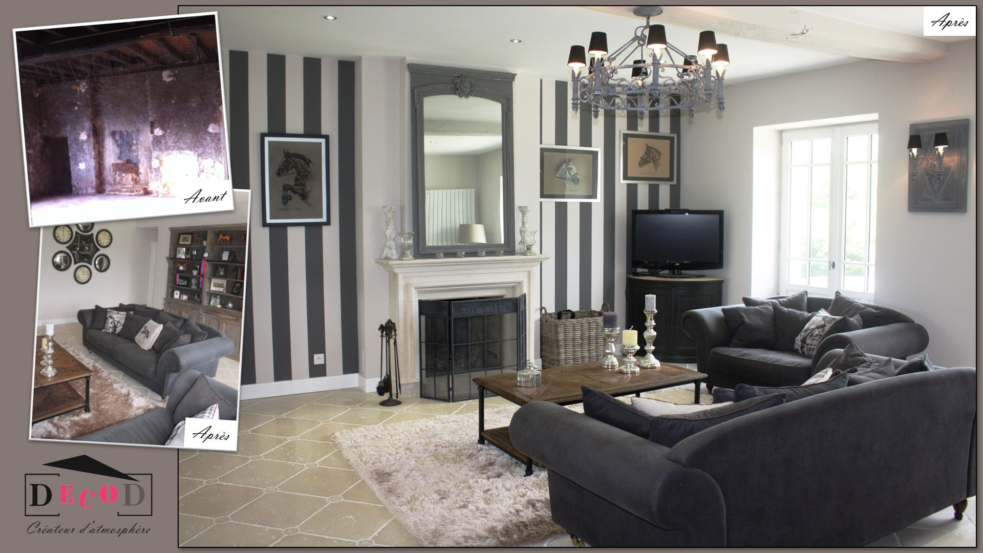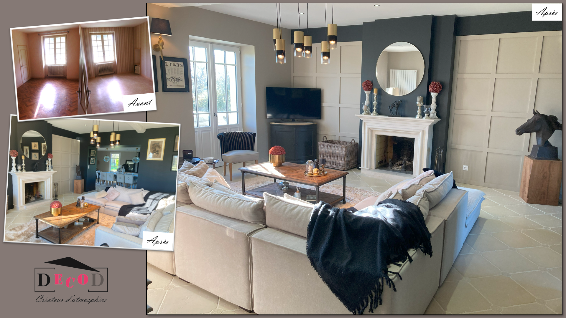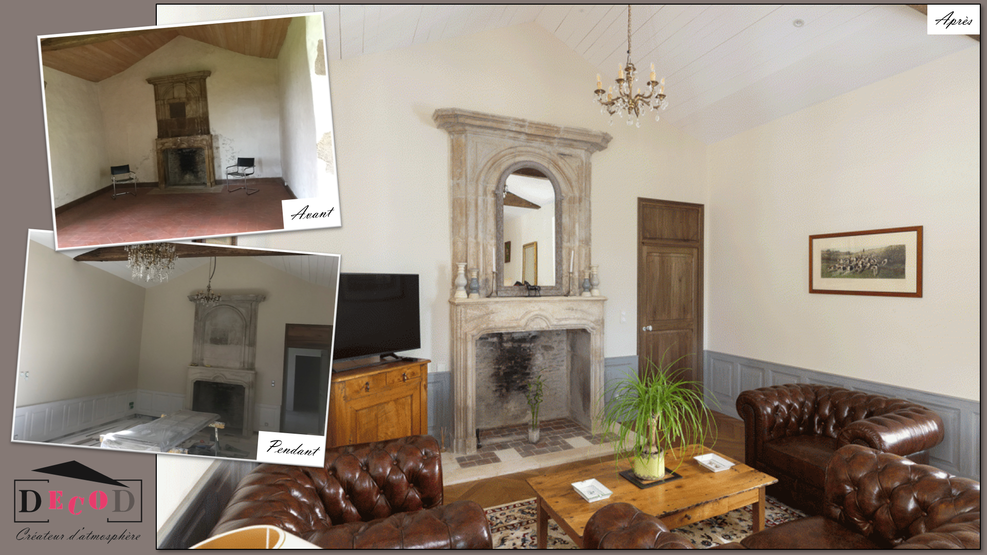 Relooking d’un salon (2009) – Cette maison ancienne a bénéficié d’une rénovation complète. Après avoir imaginé le futur aménagement, DecoD a assuré la coordination des artisans et une partie des travaux (peinture, parement, décoration)