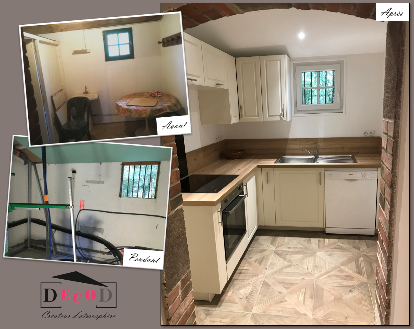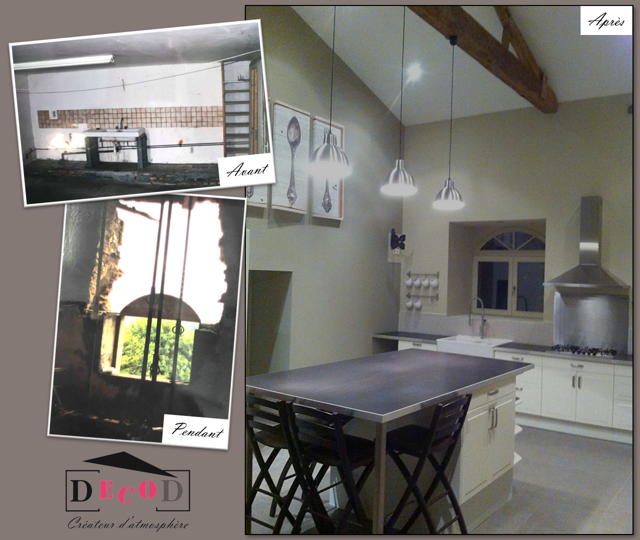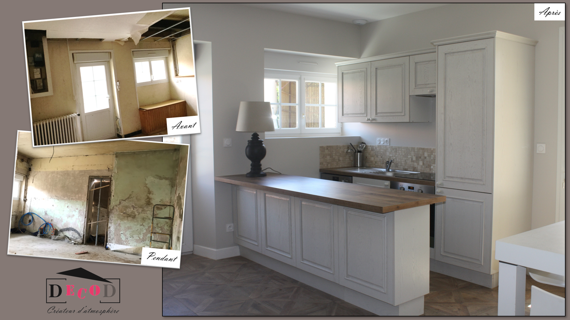 Création d’une cuisine (2014) – Dans le cadre d’une rénovation totale, DecoD a repensé l’agencement de cette maison ancienne. En réunifiant deux chambres et une salle de bain, Julie a créé une grande cuisine de charme. Si la plomberie, l’électricité et la pose du sol ont été confiées à des artisans, Julie a réalisé les placo, l’isolation, les bandes, la peinture, la faïence, la pose de la cuisine et la décoration de la pièce.