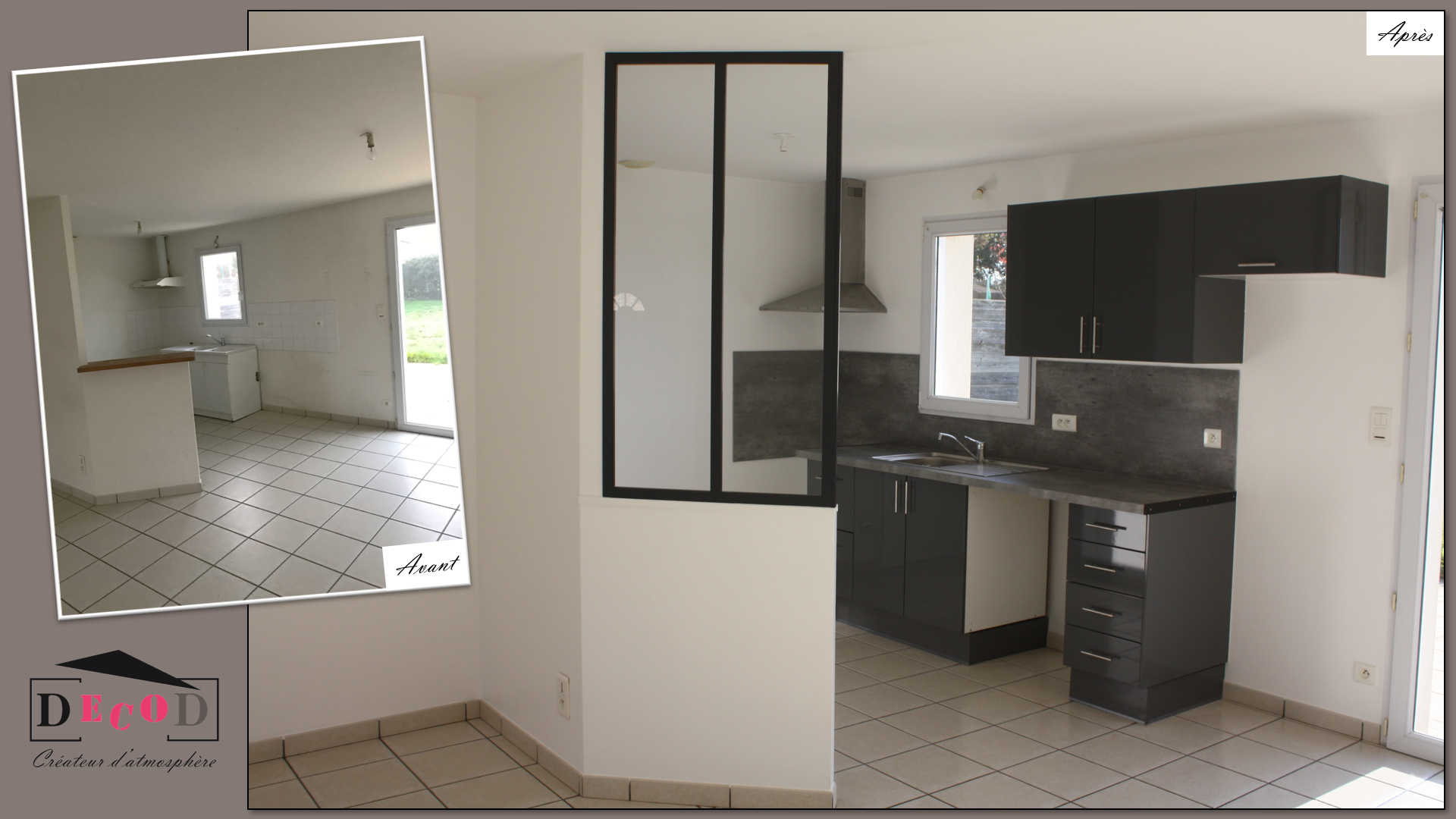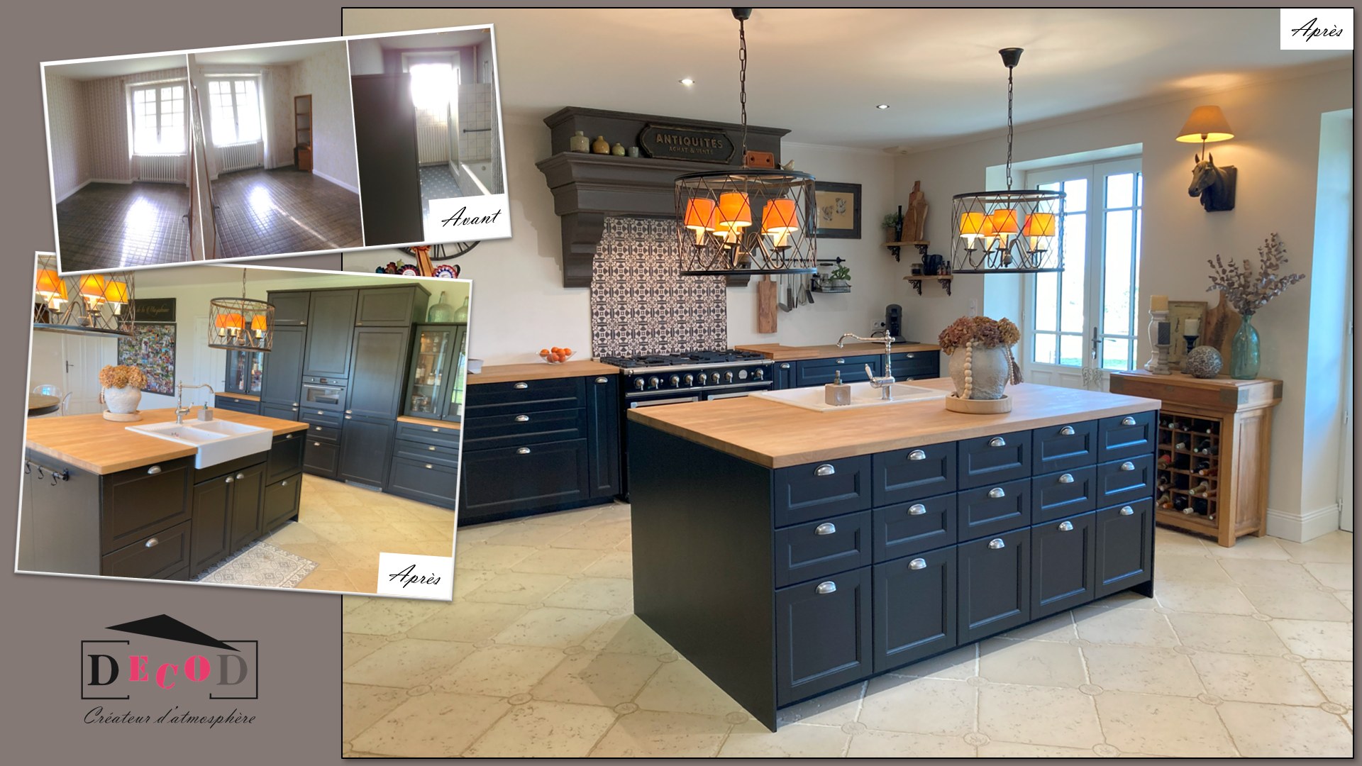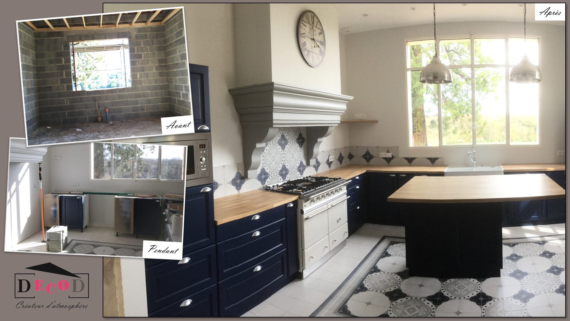 Création d’une cuisine (2014) – Dans le cadre d’une rénovation totale, DecoD a repensé l’agencement de cette maison ancienne. En réunifiant deux chambres et une salle de bain, Julie a créé une grande cuisine de charme. Si la plomberie, l’électricité et la pose du sol ont été confiées à des artisans, Julie a réalisé les placo, l’isolation, les bandes, la peinture, la faïence, la pose de la cuisine et la décoration de la pièce.