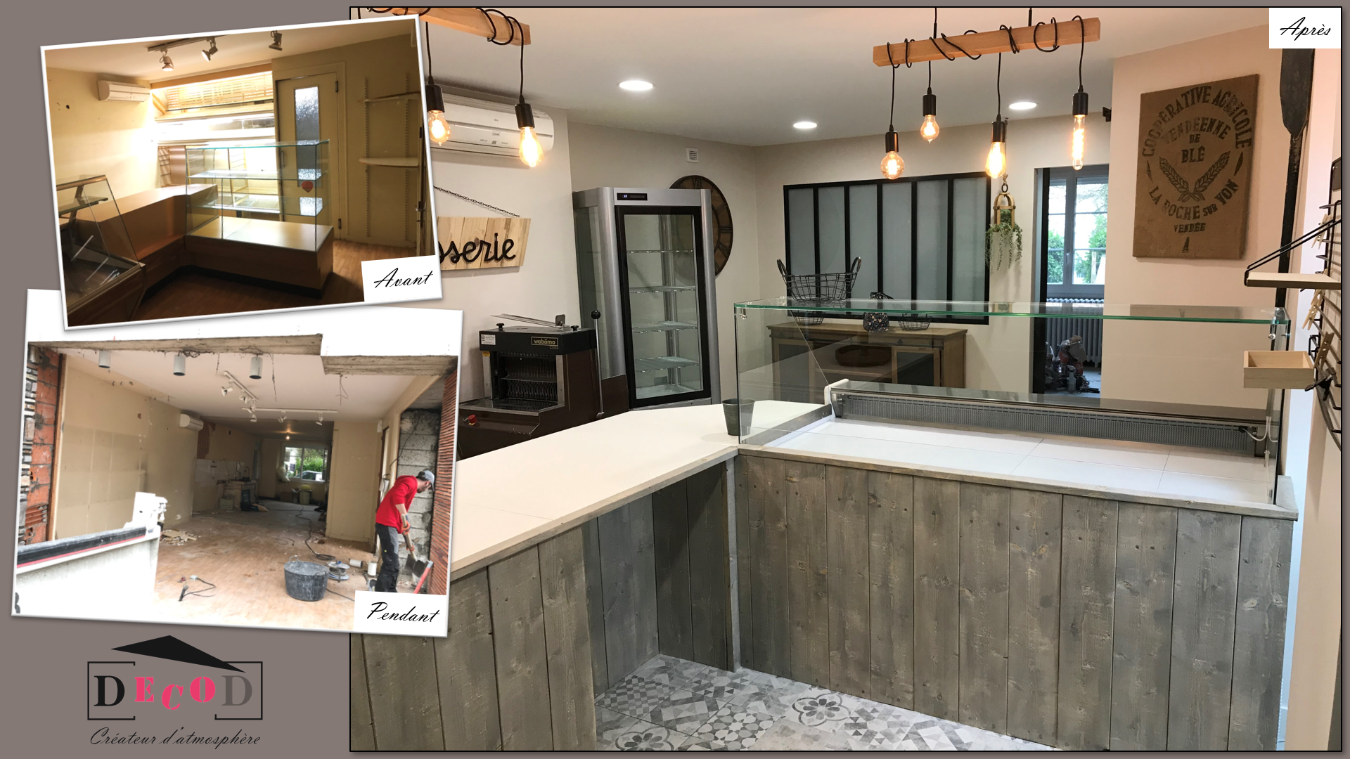Rénovation d’une boulangerie (2020) – Cette boulangerie figée en 1967 a connu une rénovation complète sous la houlette de DecoD qui a imaginé le concept, organisé et suivi les travaux puis installé la décoration.