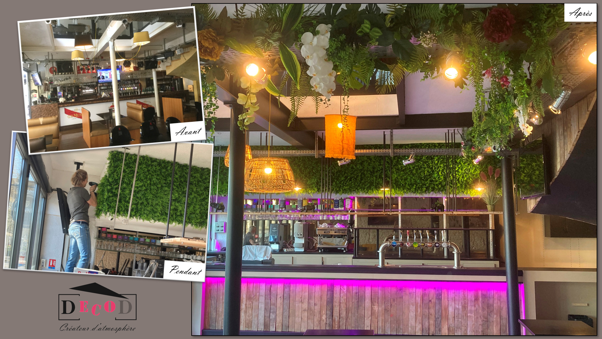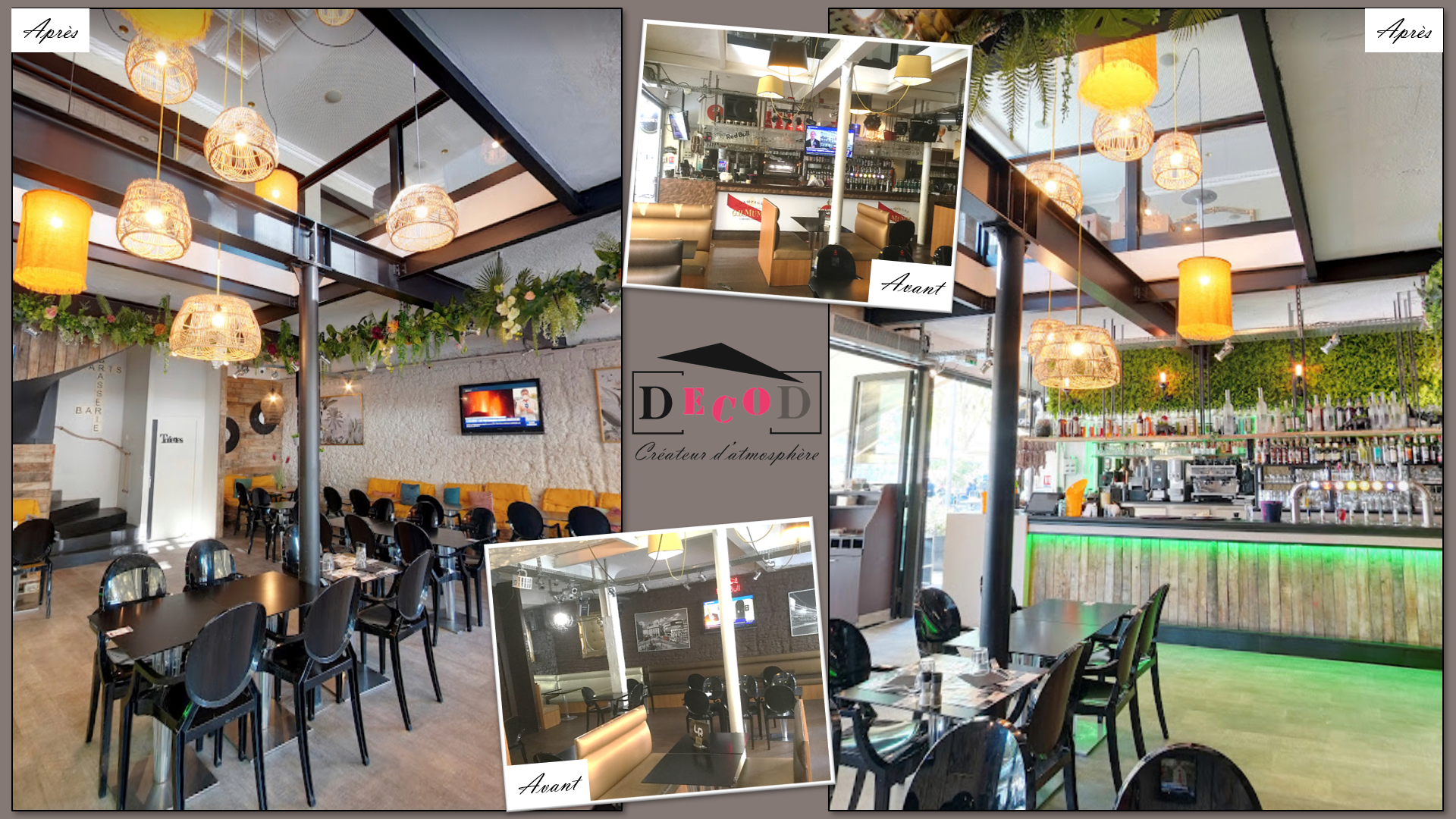 Rénovation d’un bar restaurant (2021) – Cet établissement avait besoin d’un gros rafraichissement. Son propriétaire a fait appel à DecoD pour imaginer un nouveau concept et assurer la mise en œuvre du projet (gestion des artisans et installation de la décoration).