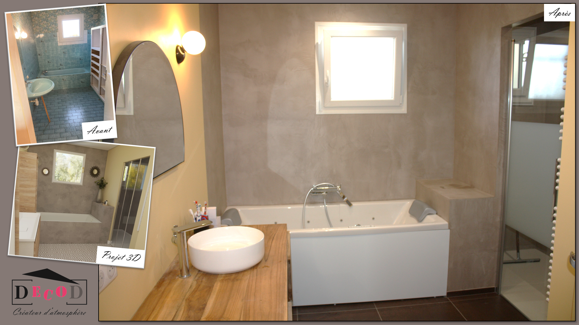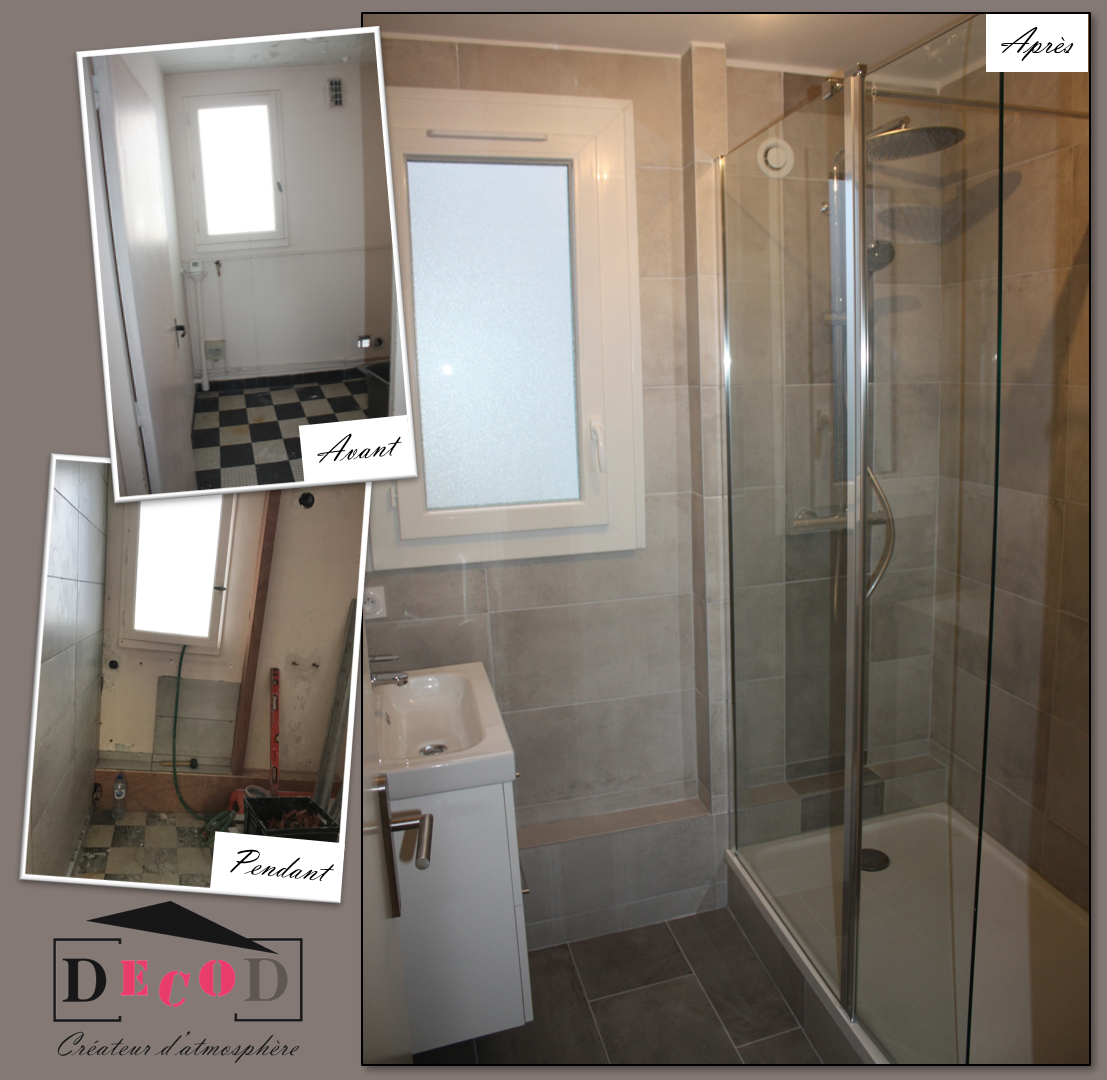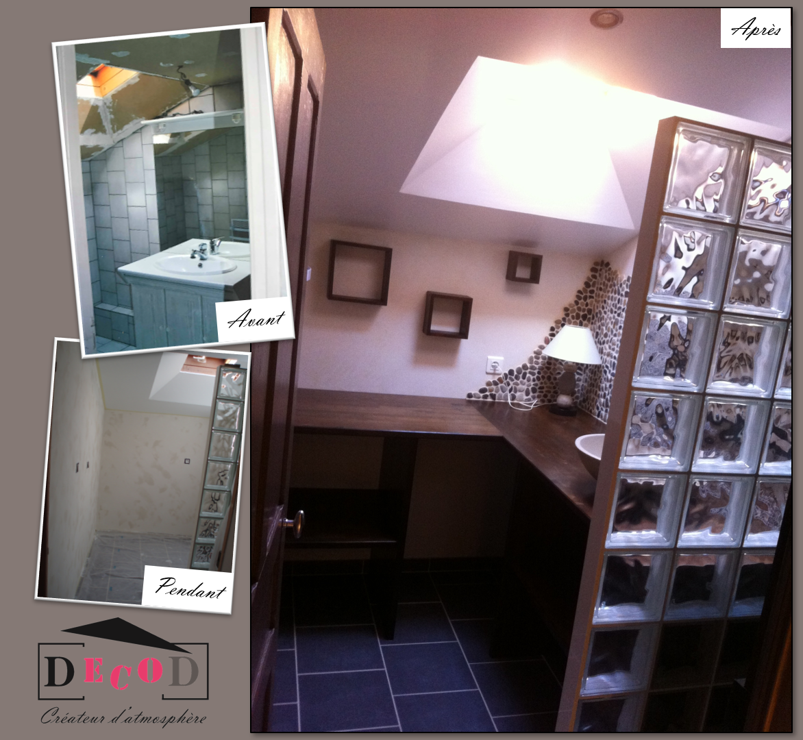 Rénovation d’une salle d’eau (2011) – DecoD a assuré la rénovation complète de cette salle d’eau (démolition, placo, bandes, tadelakt, carrelage, faïence, pavés de verre, meuble sur mesure, décoration)