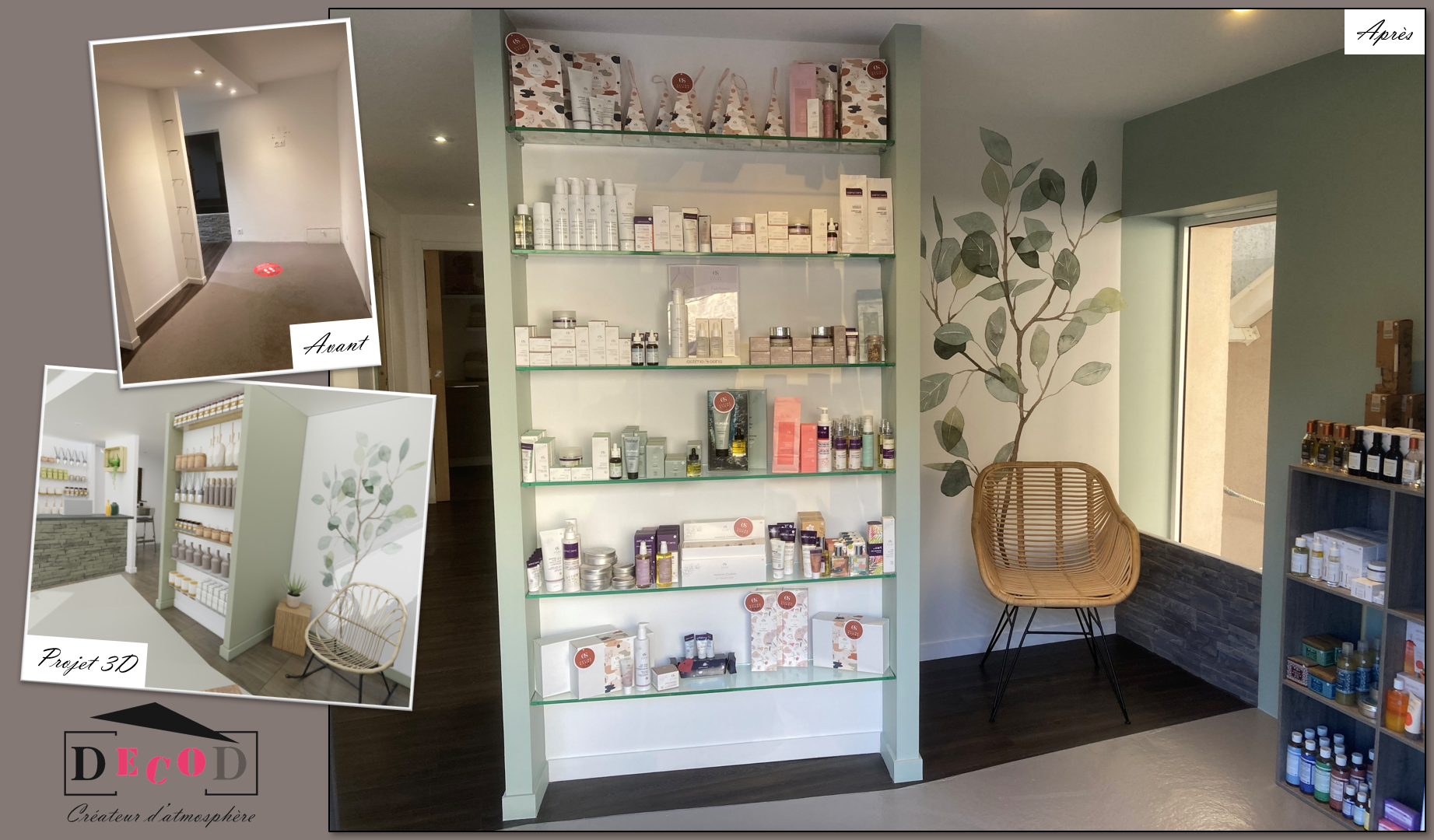 Rénovation d’un institut de beauté (2023) – DecoD a réalisé les plans, les vues 3D, le coaching aux achats et le suivi de chantier dans le cadre de la rénovation d’un institut de beauté.