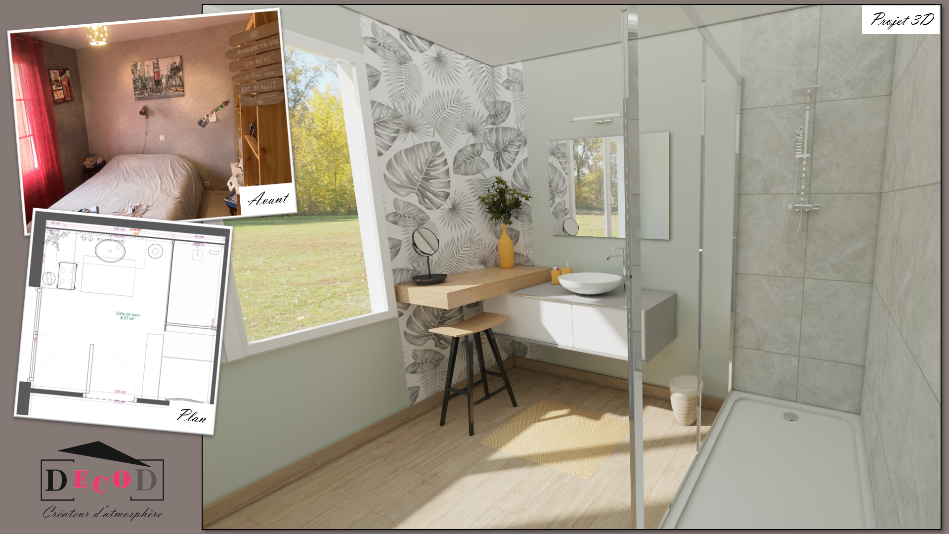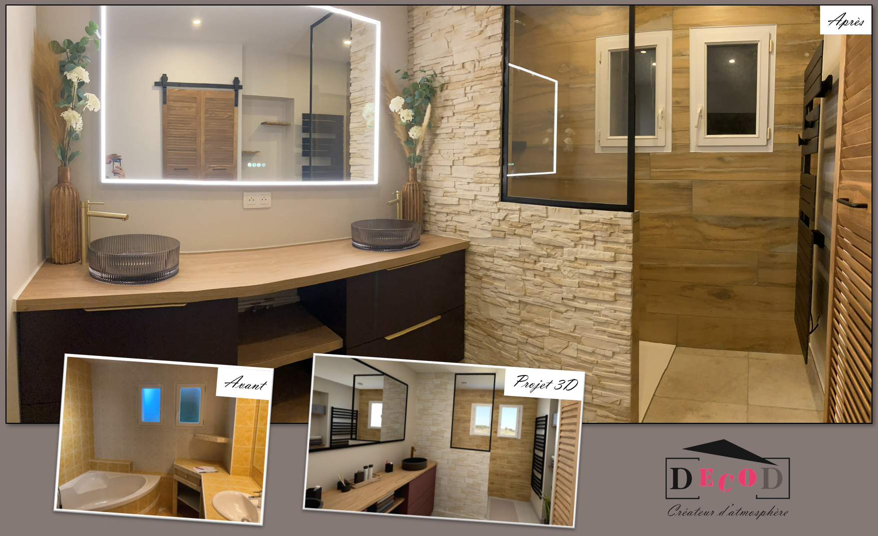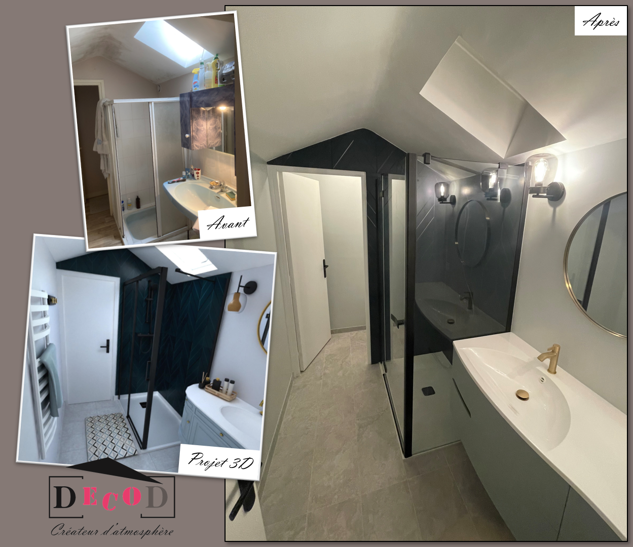 Création d’une salle d’eau (2024) – Il manquait une salle d’eau à ces clients. DecoD les a accompagné pour imaginer cette nouvelle pièce en redessinant les espaces, pour choisir la décoration et pour gérer les travaux.