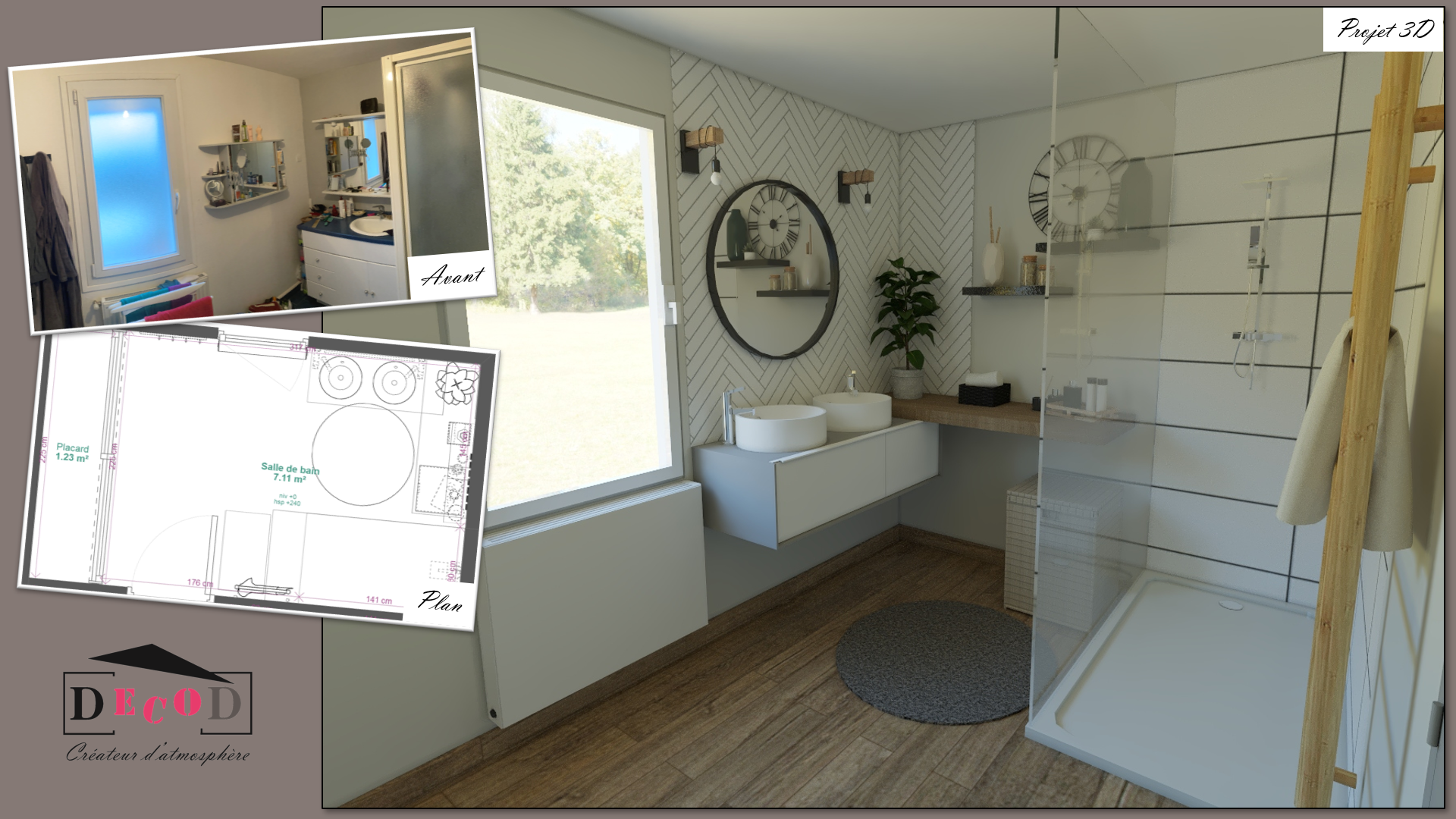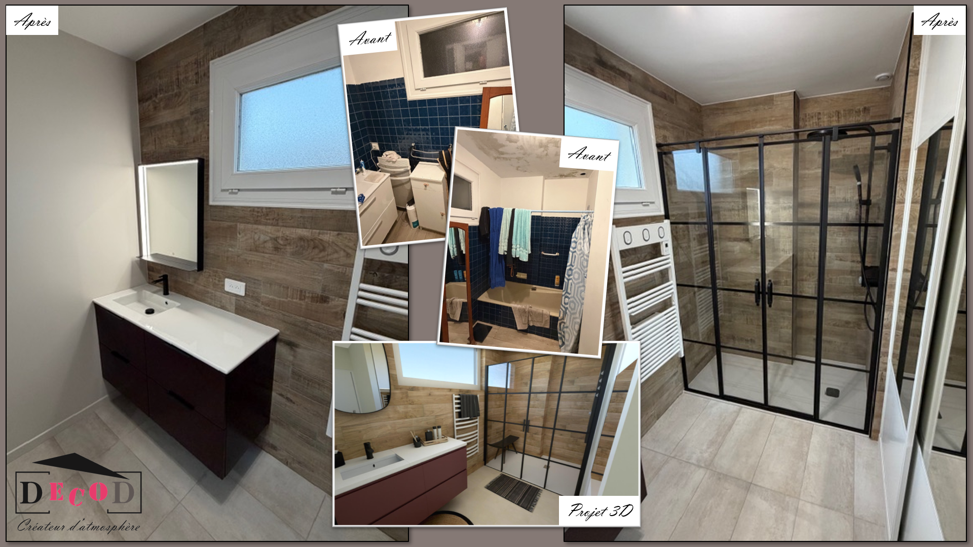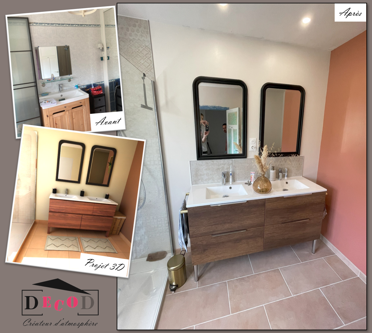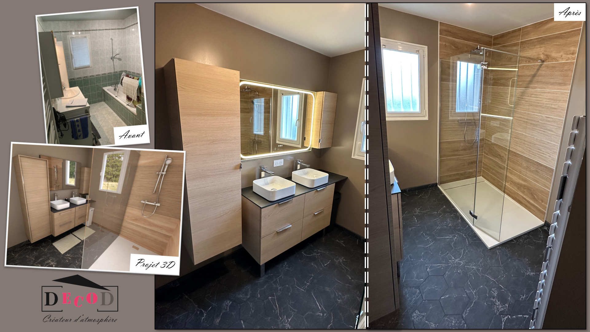 Création d’une salle d’eau (2024) – Il manquait une salle d’eau à ces clients. DecoD les a accompagné pour imaginer cette nouvelle pièce en redessinant les espaces, pour choisir la décoration et pour gérer les travaux.