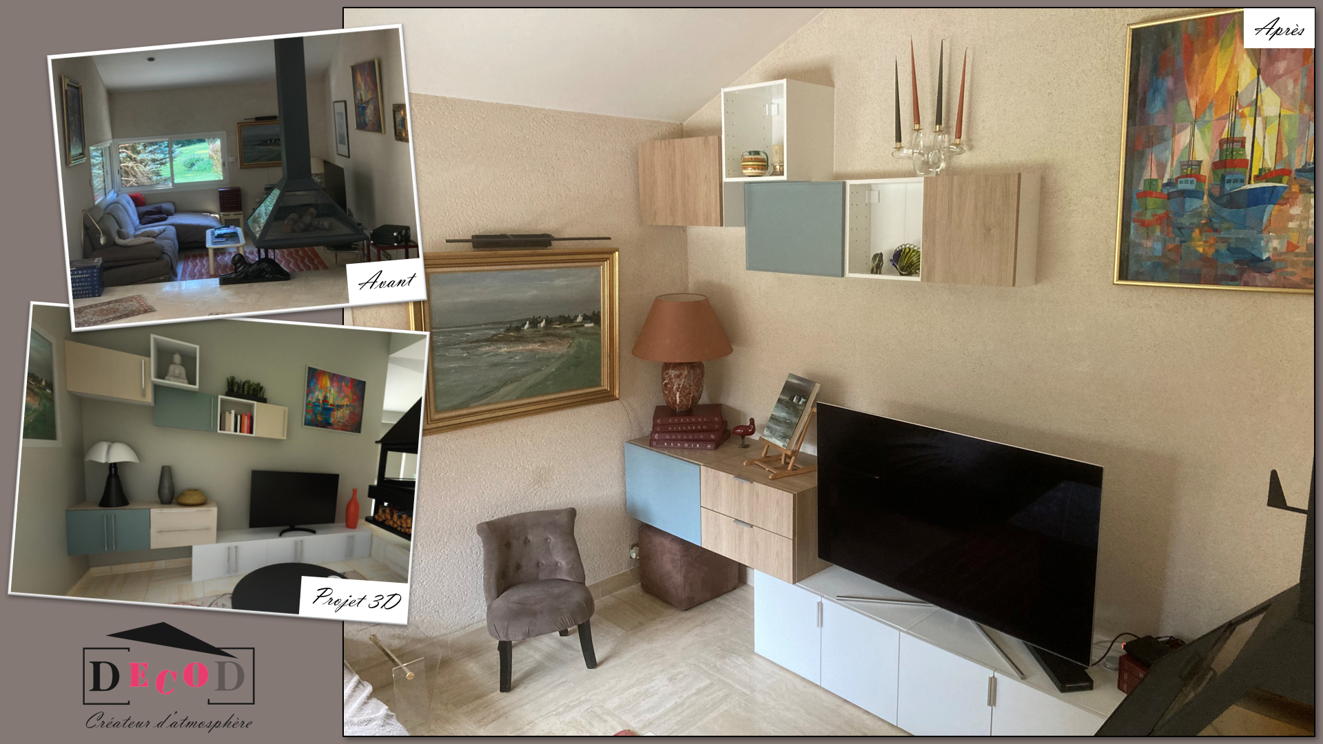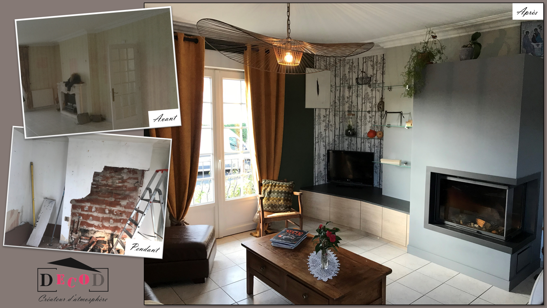 Rénovation d’une pièce de vie (2024) – Ces clients ont fait appel à DecoD pour rénover leur maison. Ils souhaitaient supprimer la cheminée et moderniser leur pièce de vie tout en préservant l’ambiance africaine que ces anciens expatriés affectionnent tant.