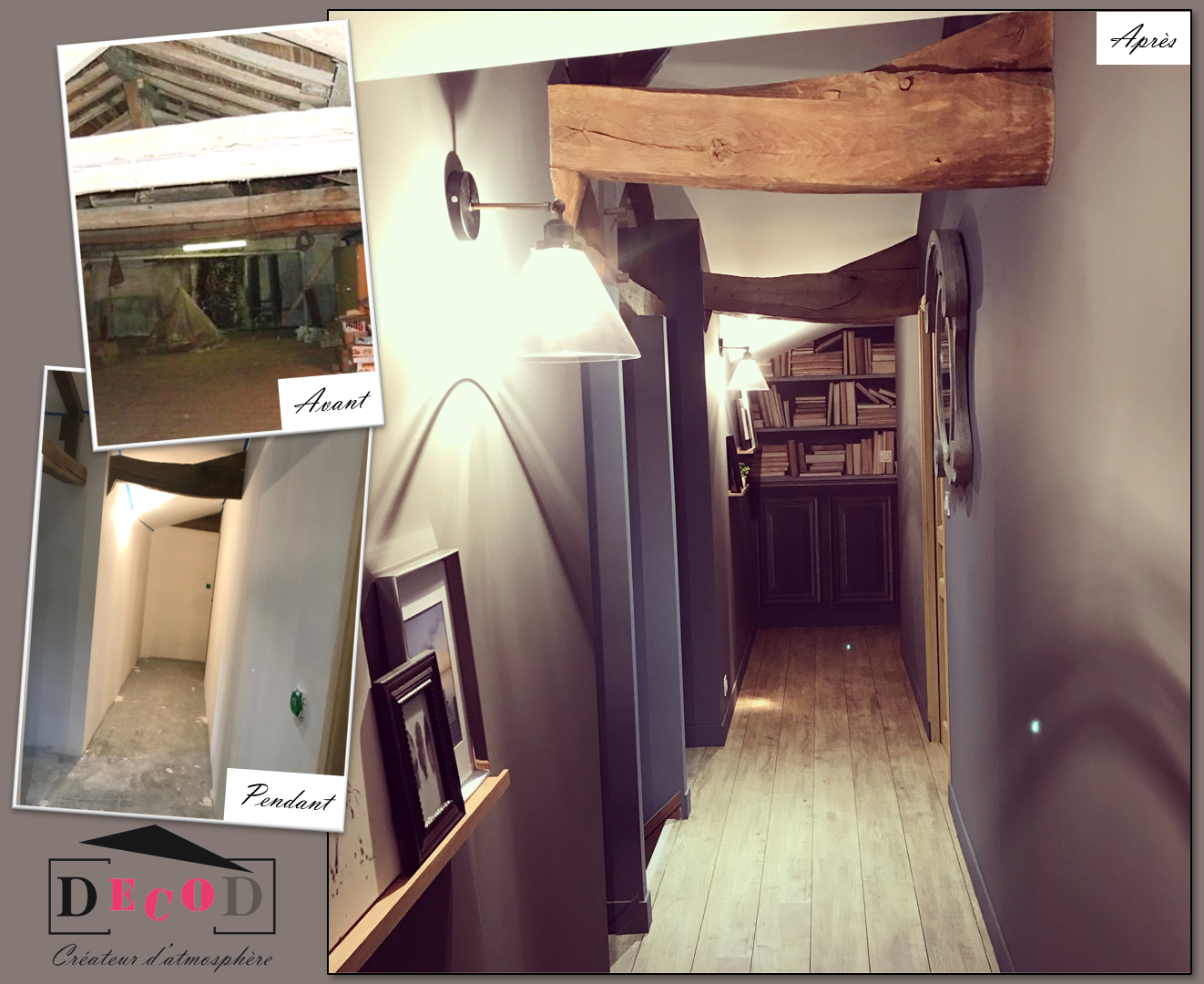 Transformation d’une grange en écurie (2014) – DecoD a conçu les plans d’aménagement de ce grenier en espace nuit avec 3 chambres, une salle de bain et un beau dégagement. Julie a réalisé la pose du placo et des portes, les bandes, la peinture, la pose du parquet et du papier peint en trompe l’oeil ainsi que l’installation de la décoration.