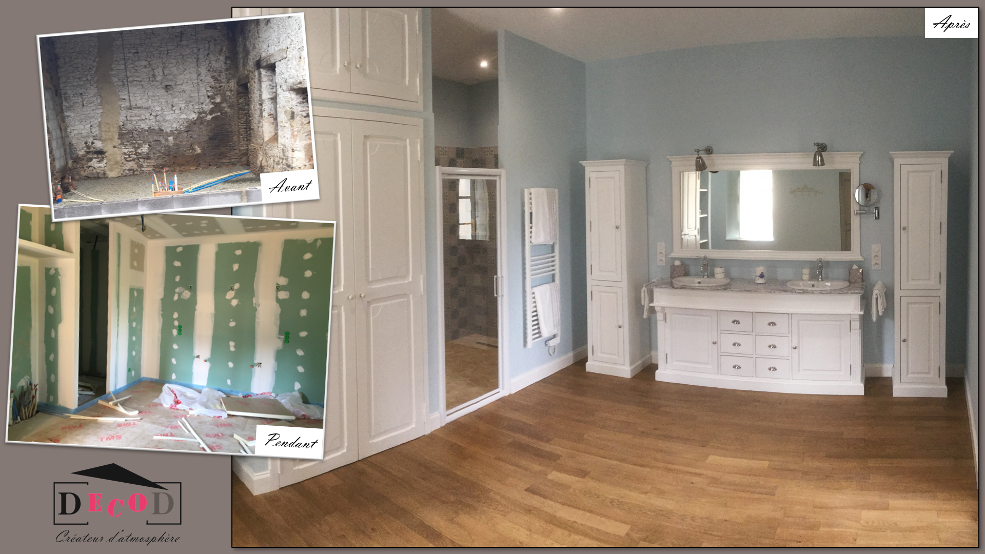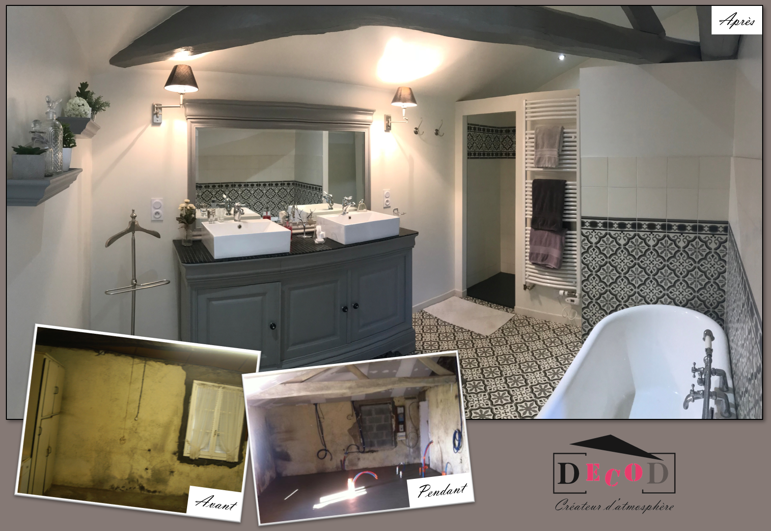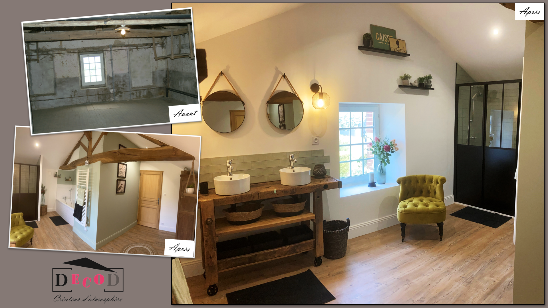 Création du salle de bain (2020) – DecoD a imaginé et créé cette salle de bain dans un ancien grenier. De l’achat des meubles et matériaux en passant par la réalisation de tous les travaux (placo, isolation, bandes, peinture, faïence, sol, décoration…), Julie a livré une salle de bain originale et élégante.