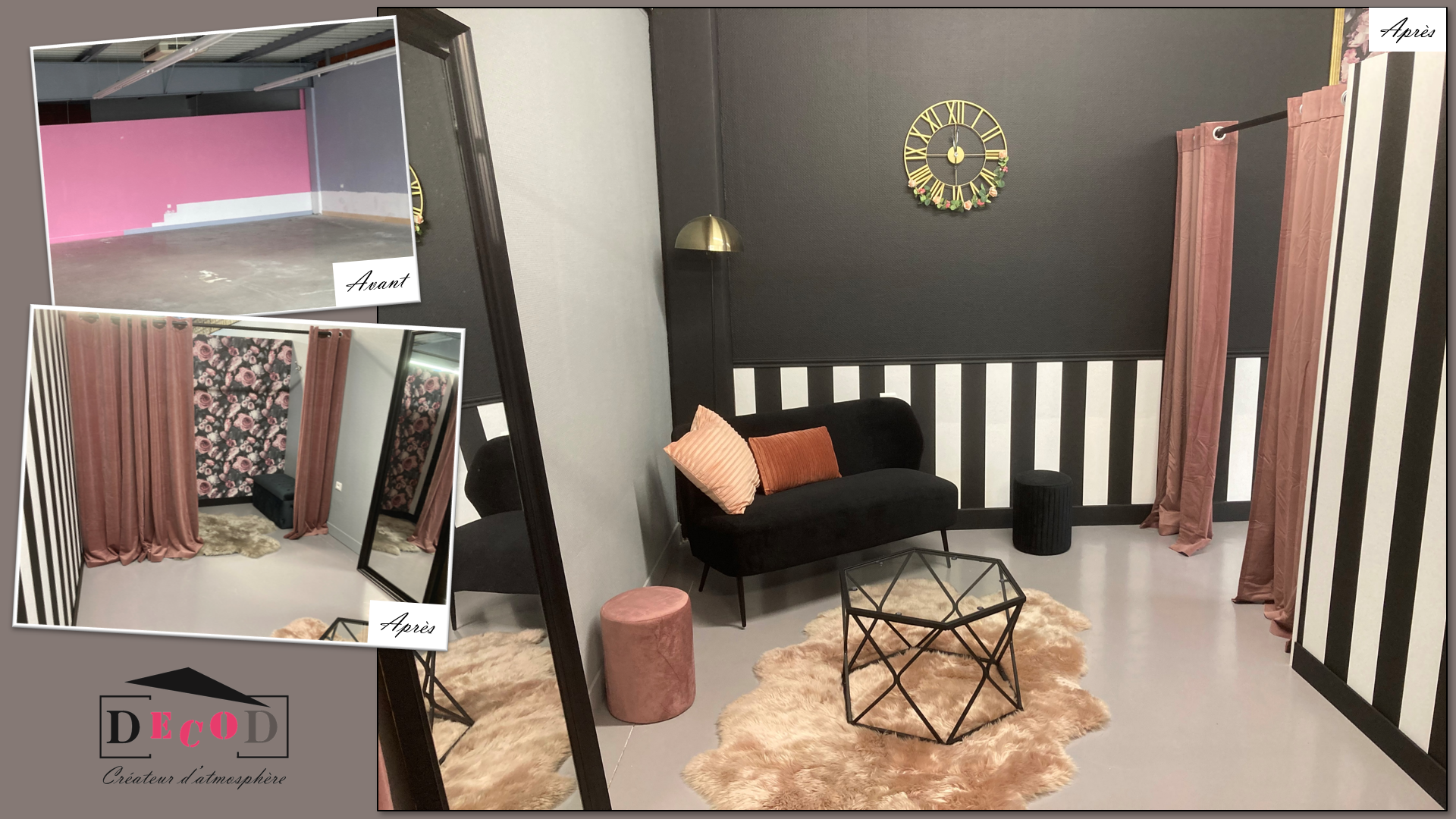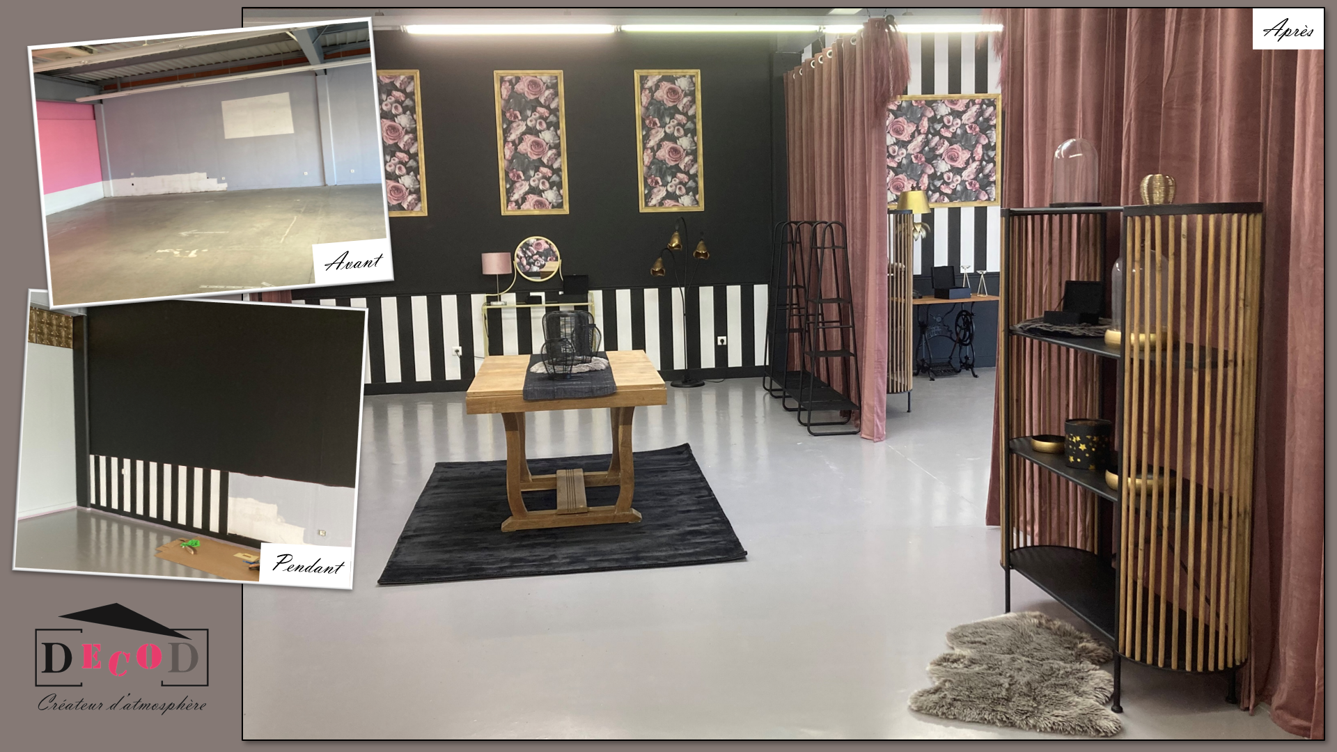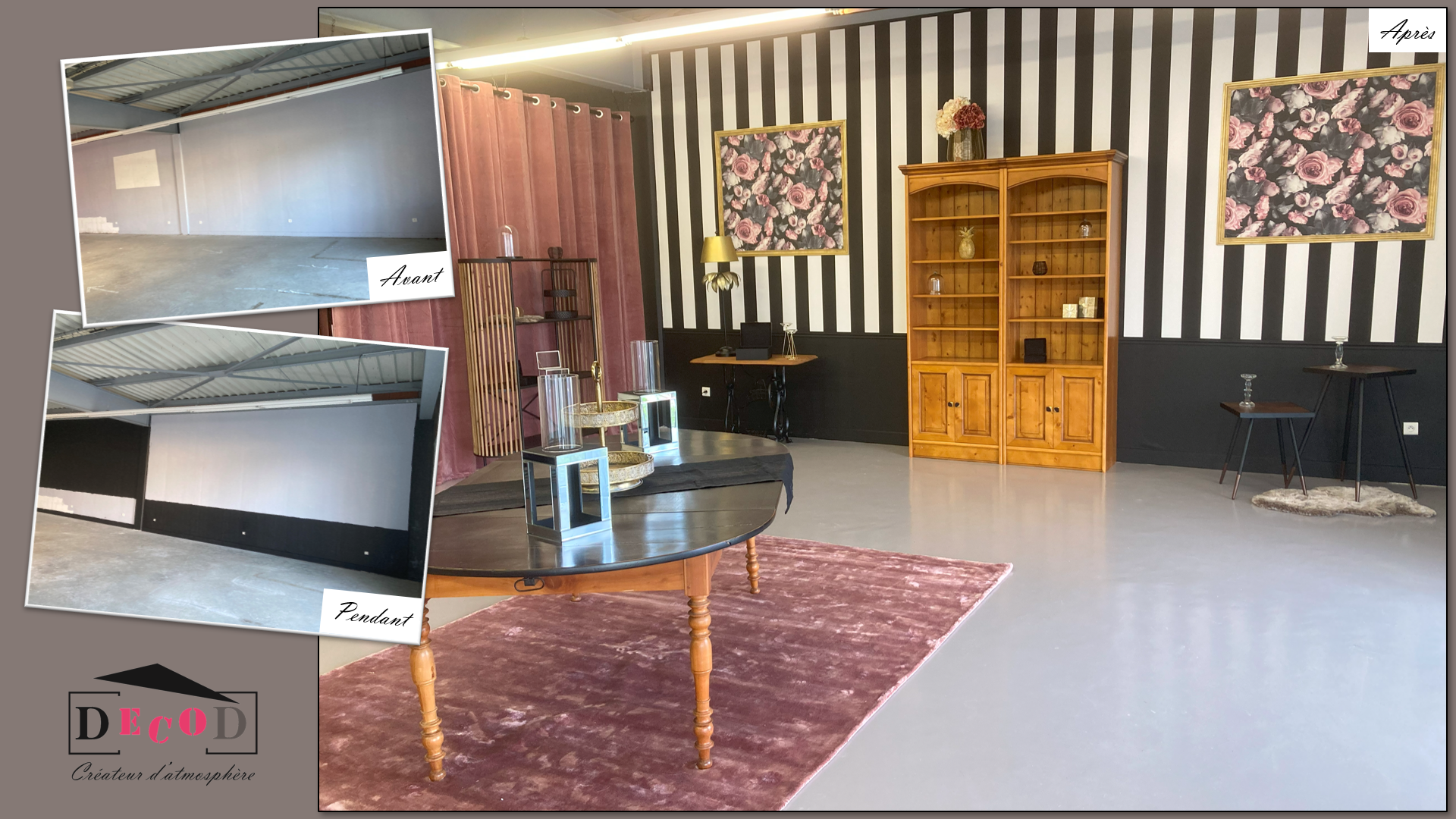Création d’une boutique (2023) – Ce projet était un vrai défi! DecoD s’est vu confier un grand bâtiment froid et en mauvais état avec pour mission de le transformer en boutique chic et chaleureuse dans un temps record et un budget restreint. Julie a donc imaginé le projet qu’elle a ensuite intégralement mis en œuvre, de l’achat des meubles et matériaux jusqu’à la peinture, la pose du papier peint et l’agencement.