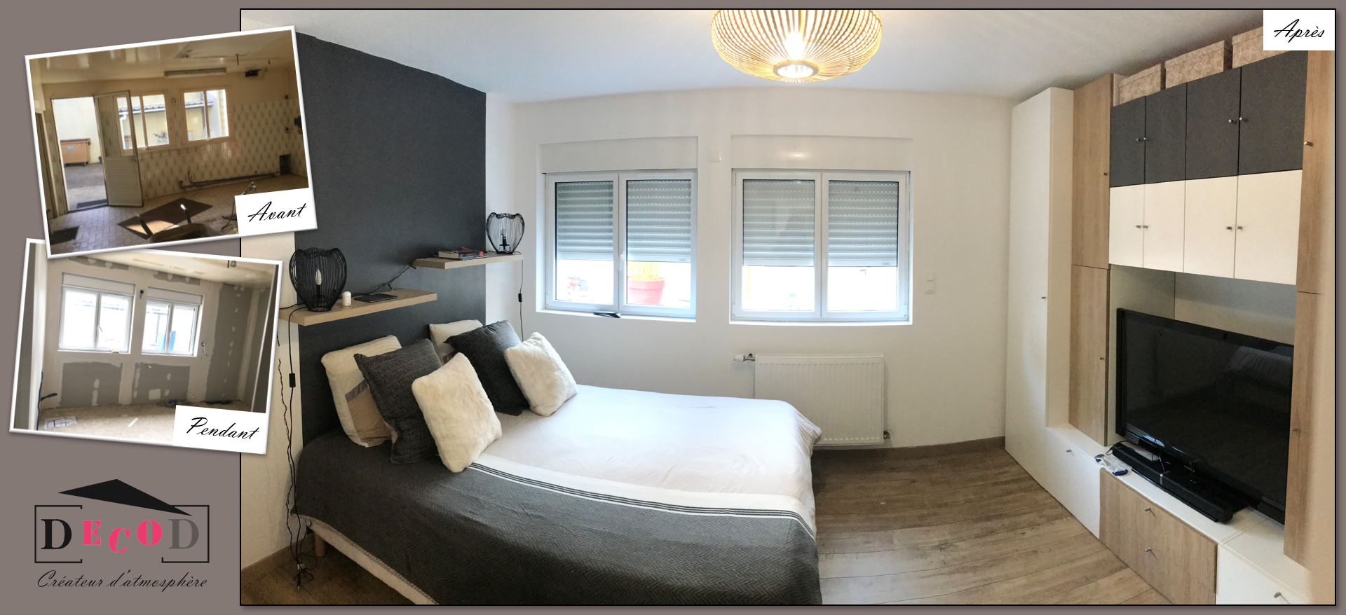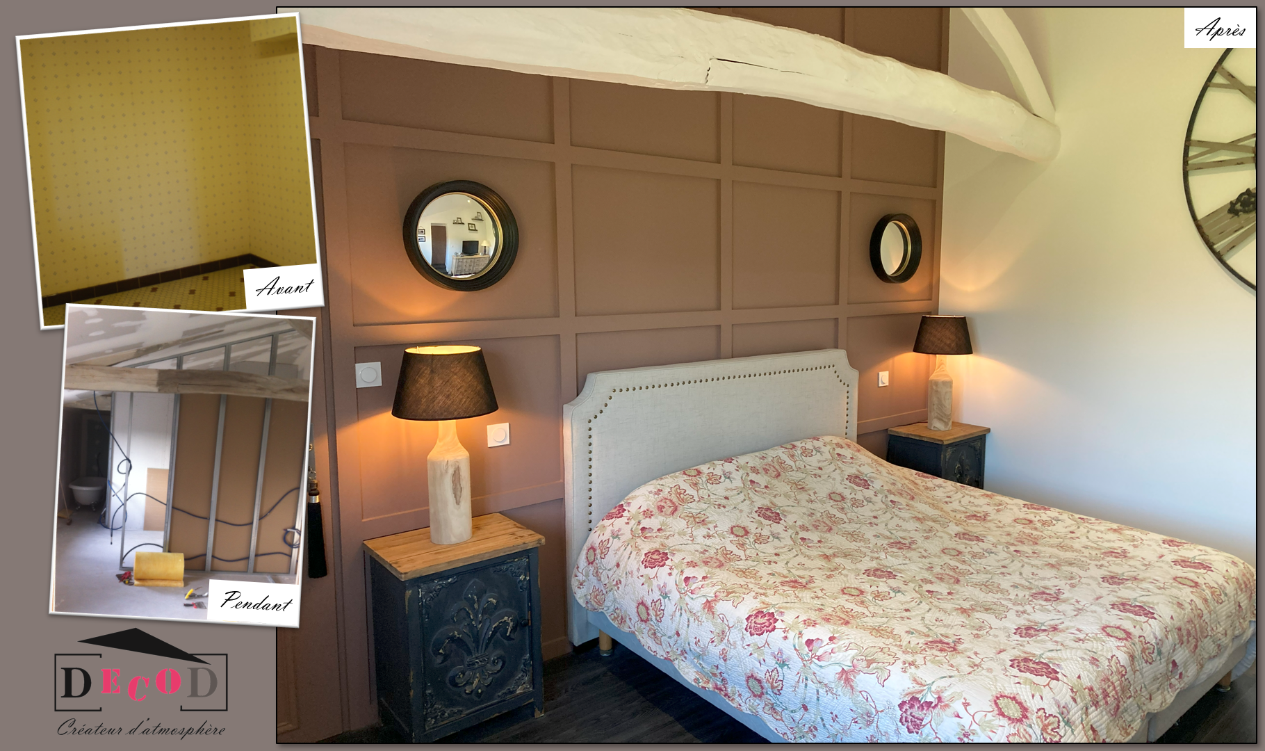 Création d’une chambre (2023) – DecoD a assuré la rénovation complète de cette maison. Julie a imaginé et créé une chambre dans une ancienne cuisine. De la démolition à l’installation de la décoration, Julie a réalisé l’ensemble des travaux (isolation, placo, bandes, peinture, pose portes, sol, panneautage, création des lampes)