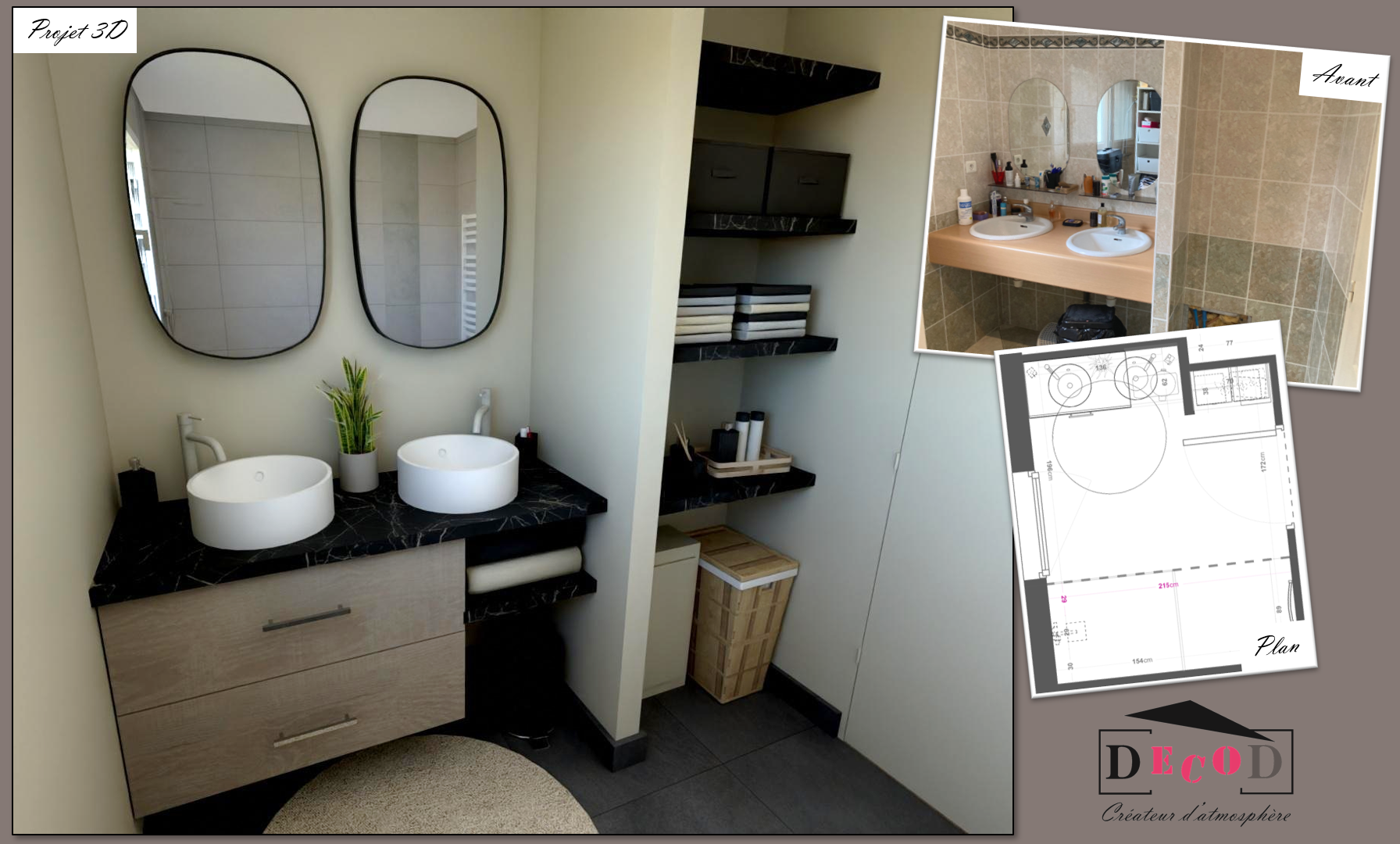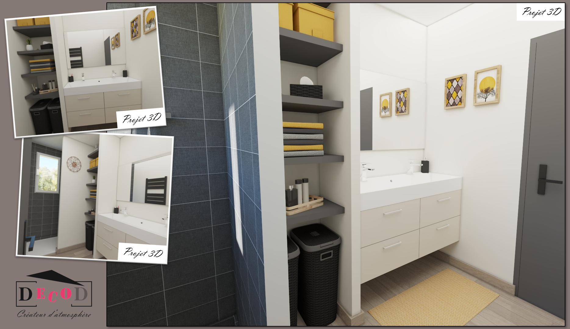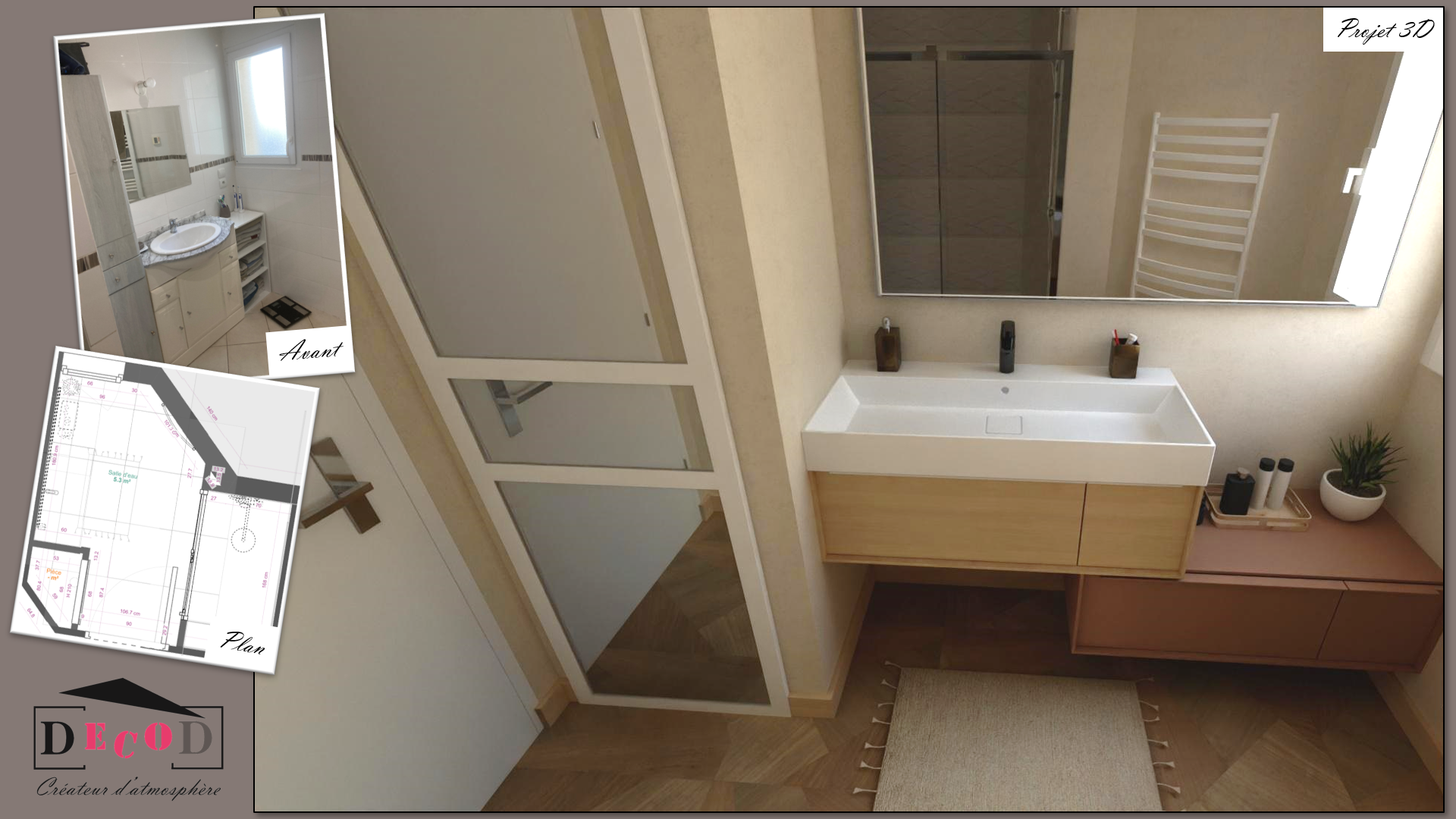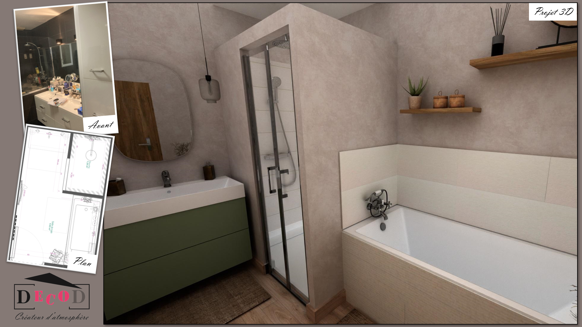 Rénovation d’une salle d’eau (2024) – Du choix des meubles et matériaux en passant par la vue 3D et en assurant la gestion des travaux, DecoD a accompagné ses clients sur ce projet de salle d’eau.