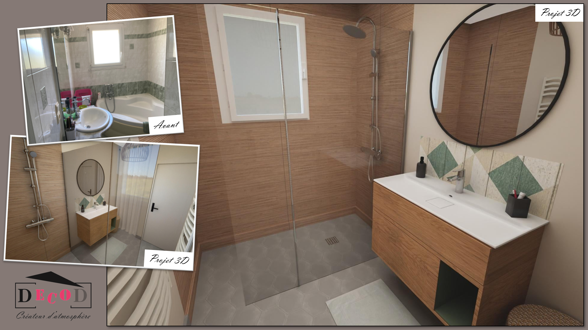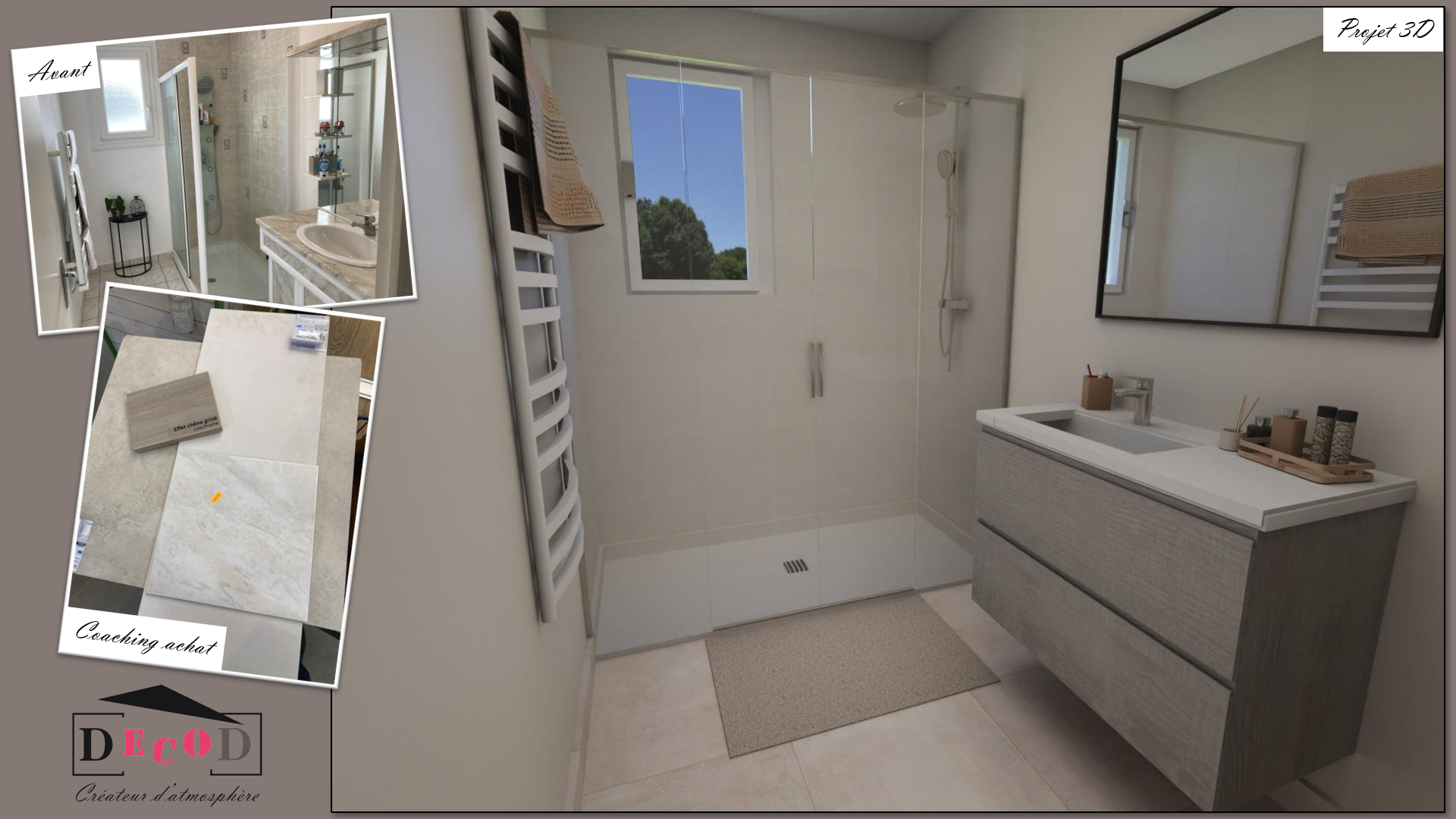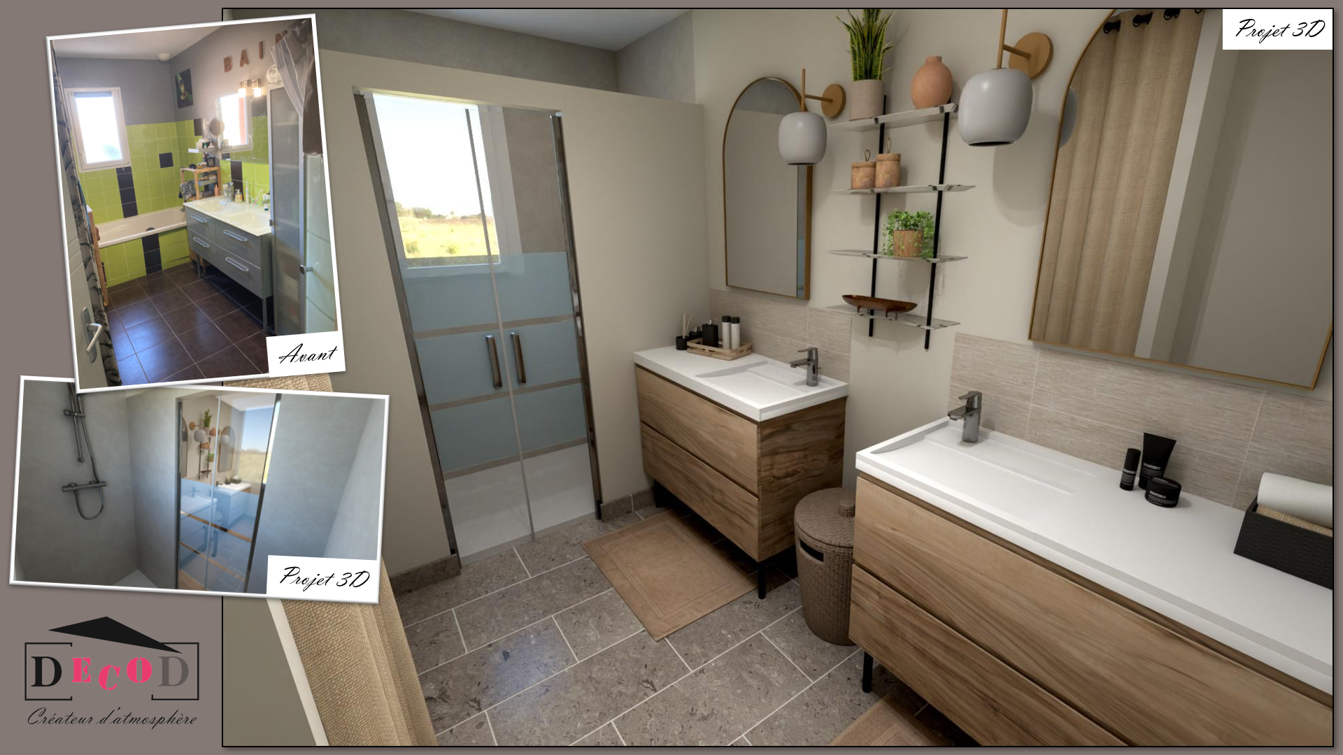 Rénovation d’une salle d’eau (2024) – Du choix des meubles et matériaux en passant par la vue 3D et en assurant la gestion des travaux, DecoD a accompagné ses clients sur ce projet de salle d’eau.