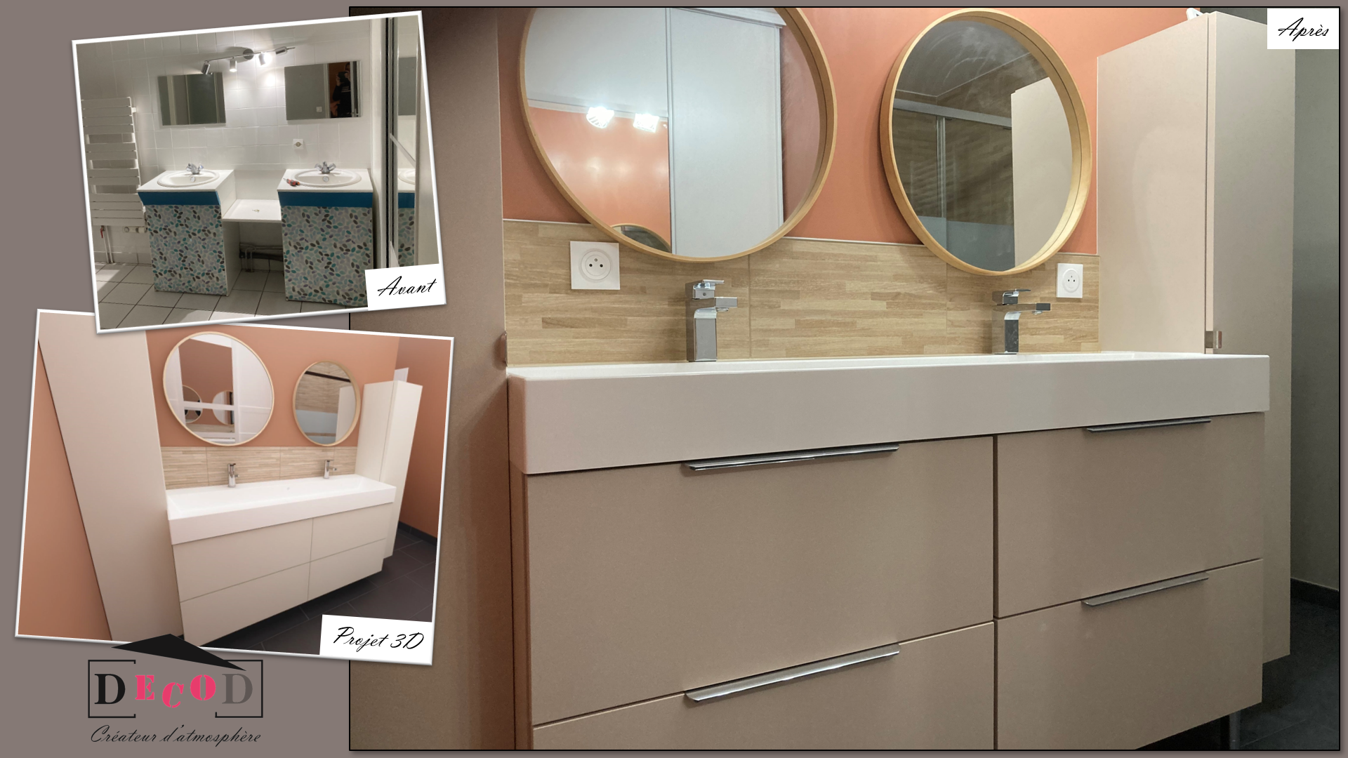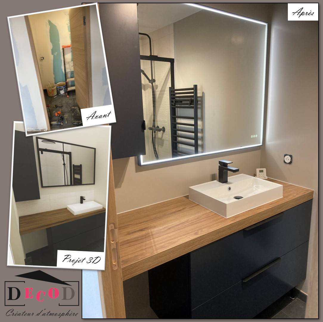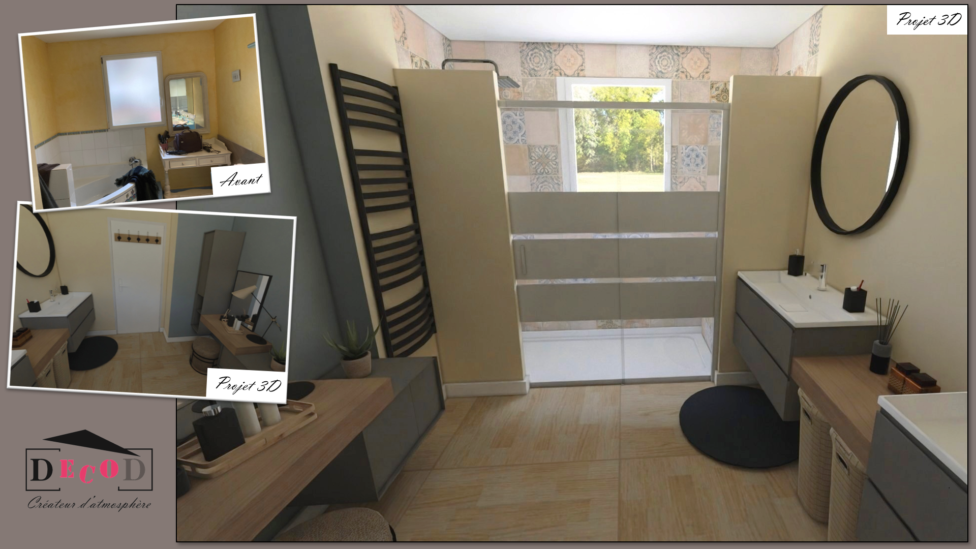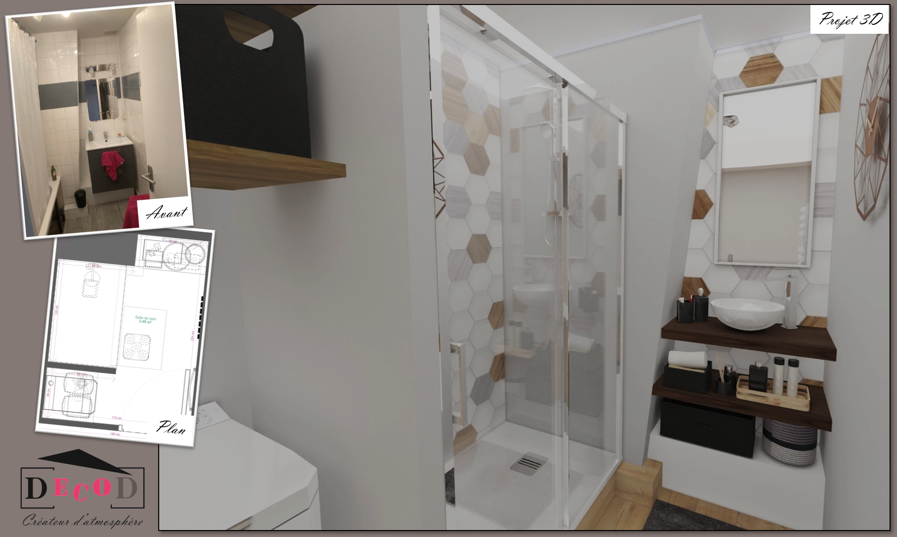 Rénovation d’une salle d’eau (2024) – Du choix des meubles et matériaux en passant par la vue 3D et en assurant la gestion des travaux, DecoD a accompagné ses clients sur ce projet de salle d’eau.
