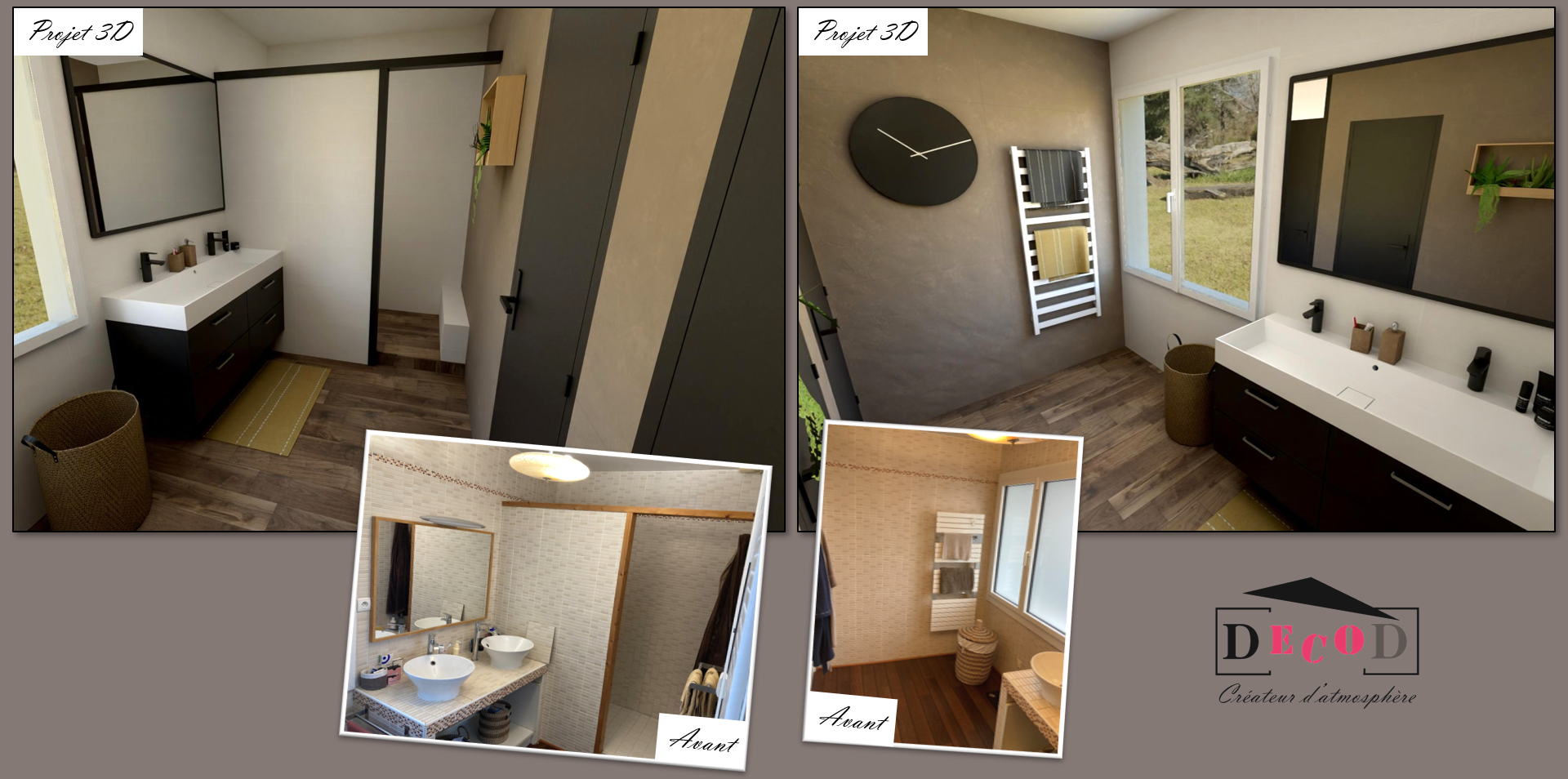 Rénovation d’une salle de bain (2021) – Ayant peur de se tromper dans ses choix au moment de rénover sa suite parentale, cette cliente a demandé à DecoD de faire un plan des futurs espaces et des vues 3D de la salle de bain. Grâce à ces éléments, la cliente a pu conduire elle-même les travaux avec ses artisans.
