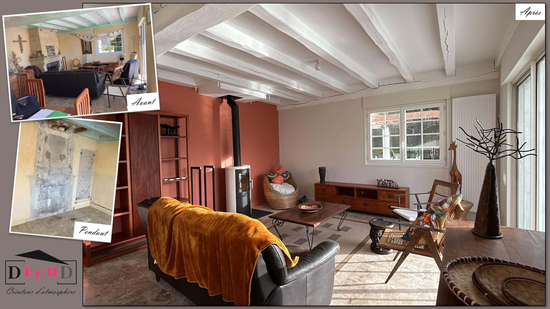 Création d’un salon (2024) – En réunifiant deux chambres, DecoD a créé un bel espace salon au sein de cette maison ancienne. En dehors de l’électricité, de la pose du sol et de l’installation de la cheminée, Julie a réalisé les travaux d’aménagement et de décoration de cette pièce (placo, isolation, bandes, peinture, panneautage)