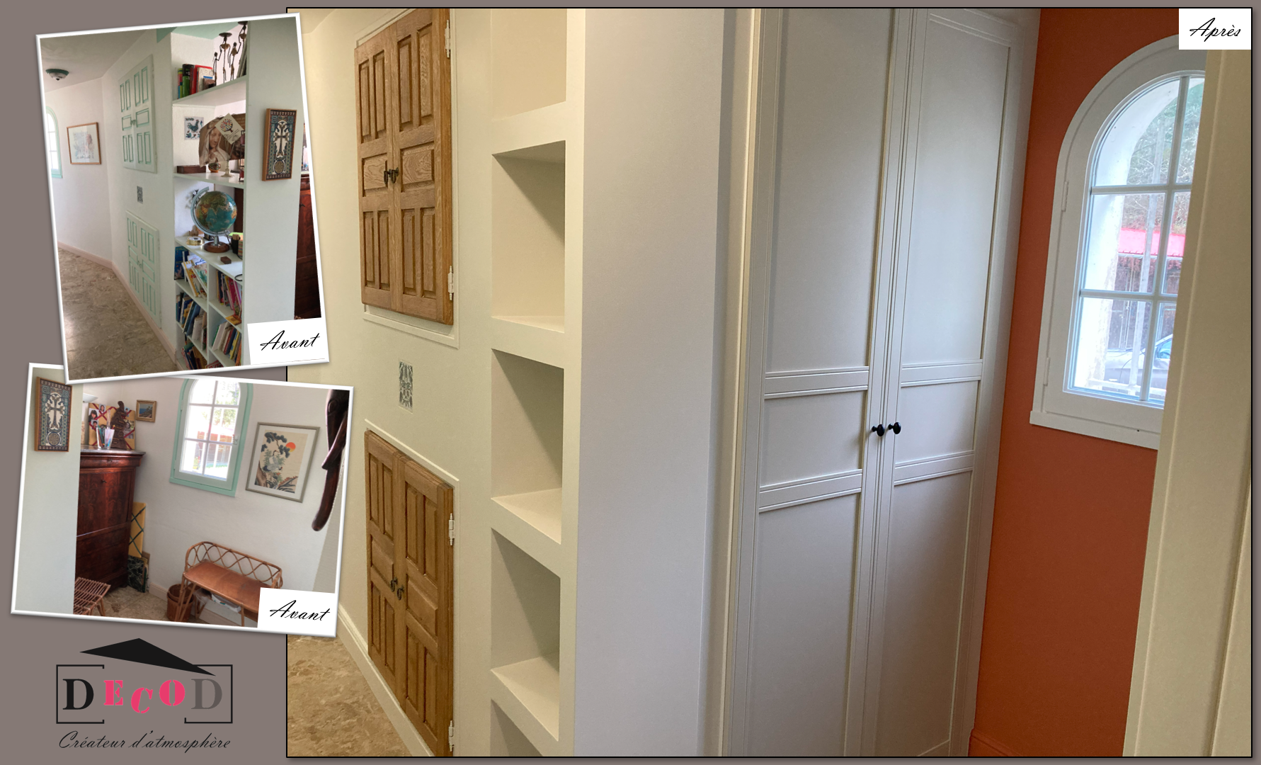 Optimisation des espaces (2024) – Dans le cadre d’une rénovation globale, DecoD a optimisé les mètres carrés de cette maison. Julie a créé un vestiaire dans un espace sans fonction et relooké le dégagement.