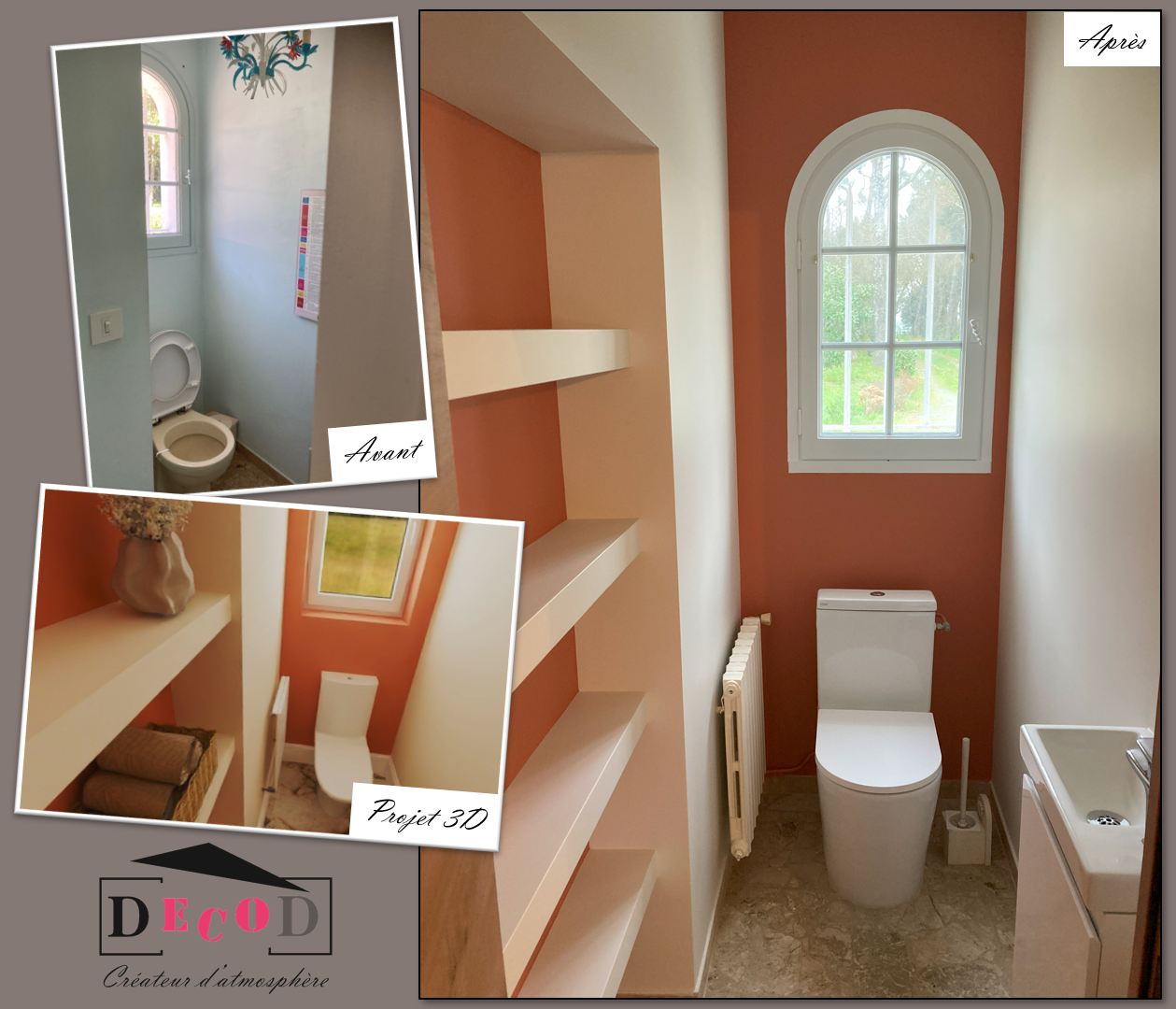 Rénovation de toilettes (2024) – Dans le cadre d’une rénovation globale, DecoD a optimisé les mètres carrés de cette maison. Julie a ainsi modifié l’accès aux WC, tout en les relookant.