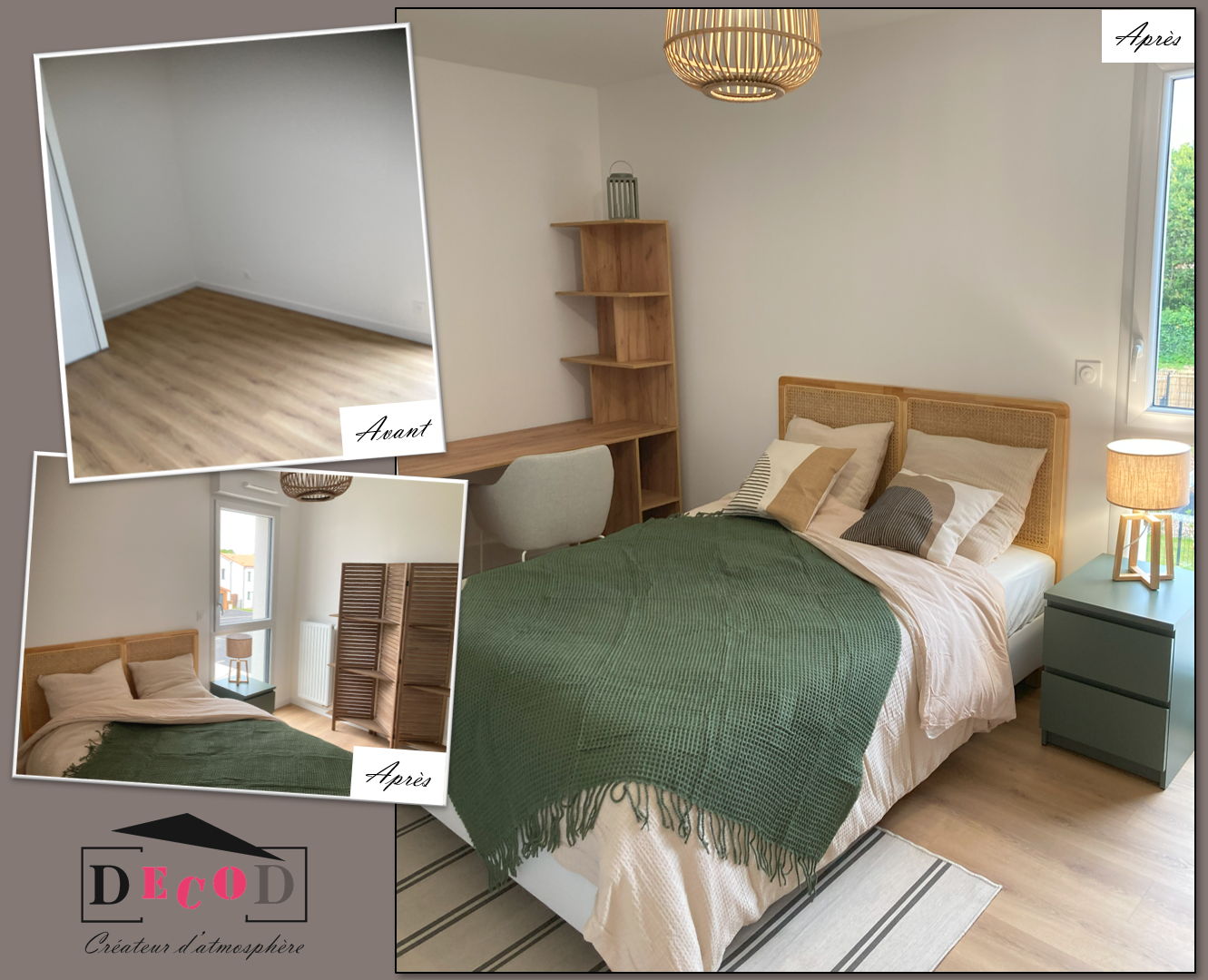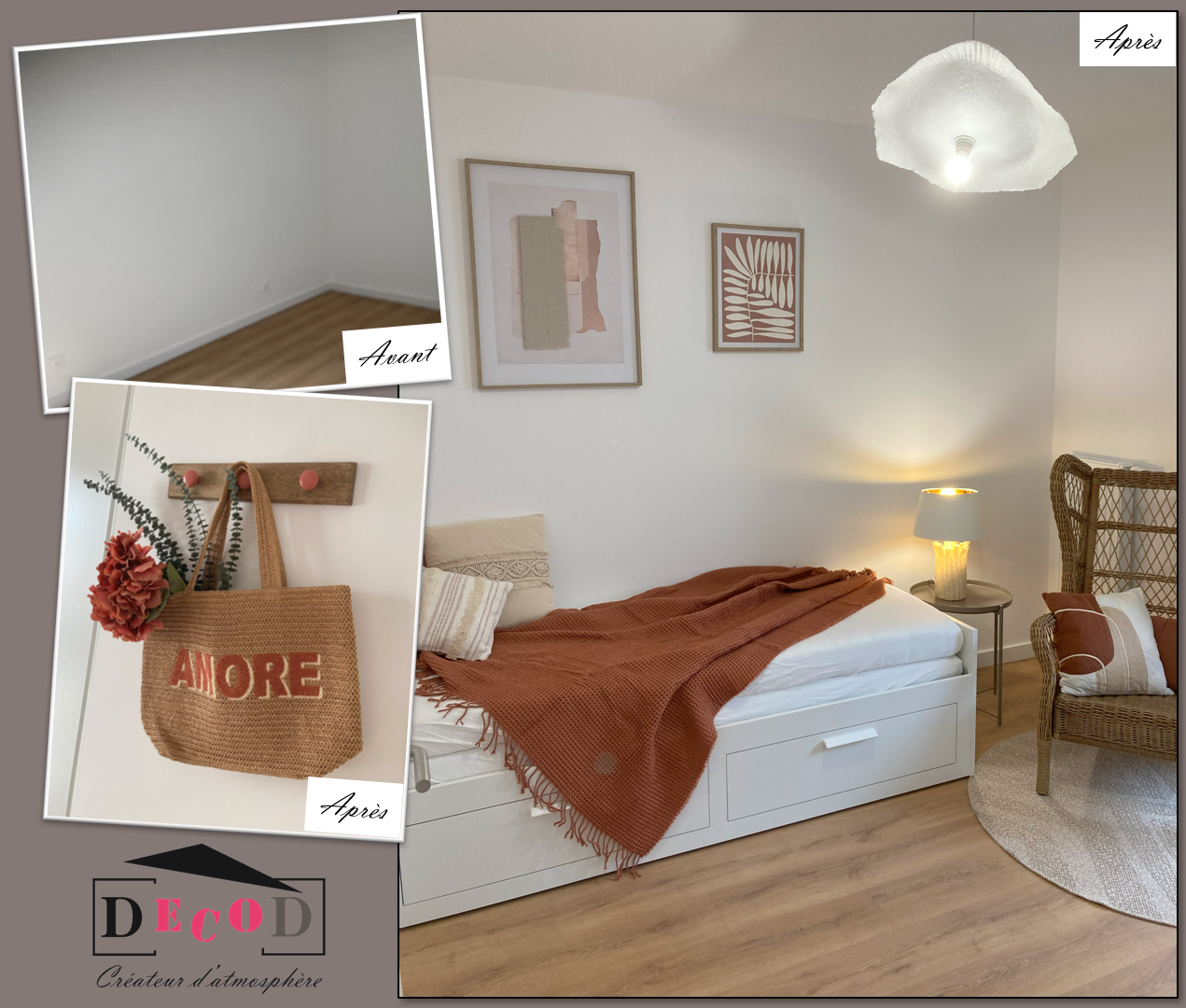 Ce client, très occupé, a demandé à DecoD de gérer de A à Z l’aménagement d’un appartement secondaire. Après avoir repeint les murs et posé un joli papier peint panoramique, Julie a effectué les achats de meubles et de décoration, avant de les mettre en scène. Le client a eu le plaisir de découvrir son appartement prêt à l’emploi et a adoré cette ambiance invitant à la détente.