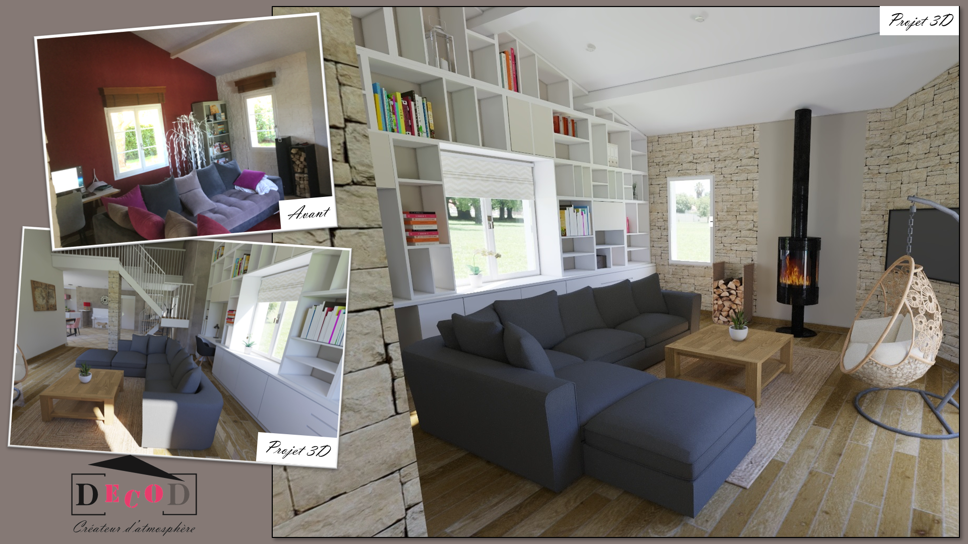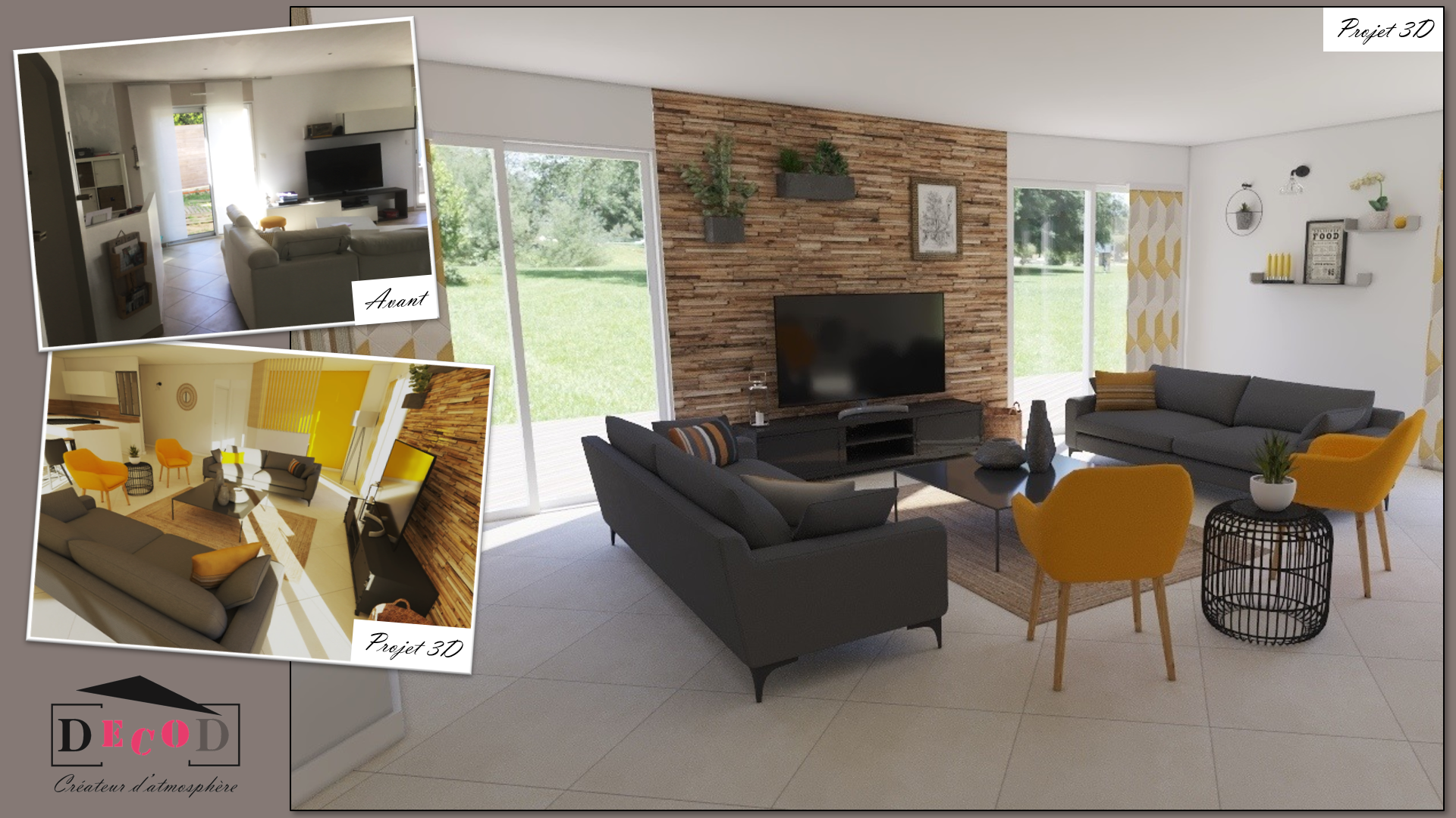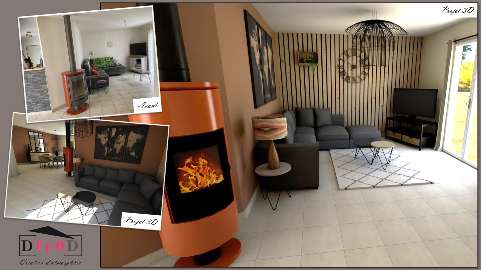 Projet de relooking d’une pièce de vie (2023) – Ces clients ont demandé des vues 3D à DecoD afin de les aider à se projeter dans une pièce de vie plus chaleureuse en retravaillant uniquement les murs.