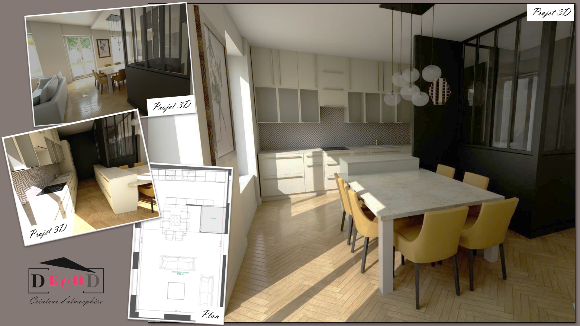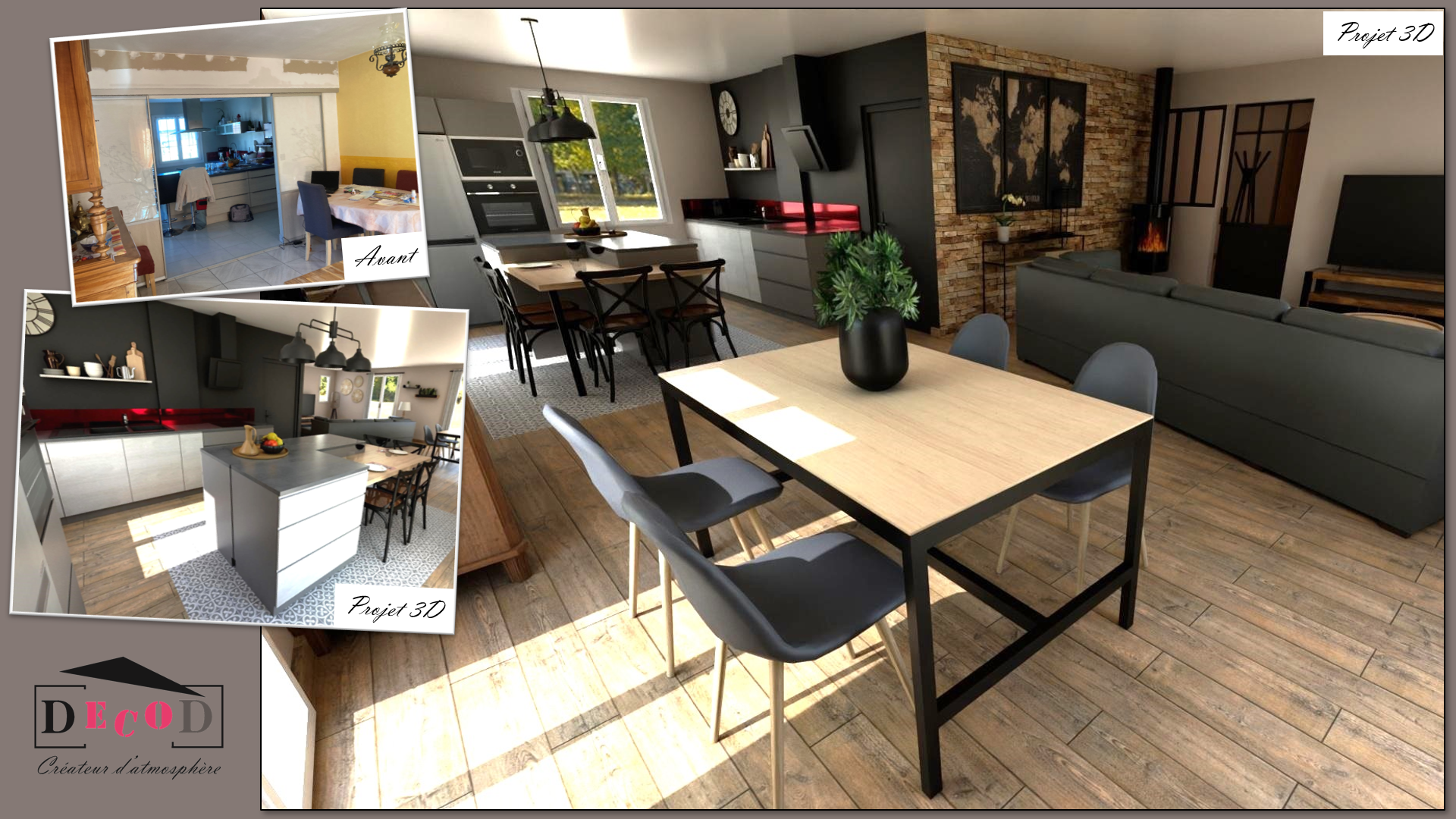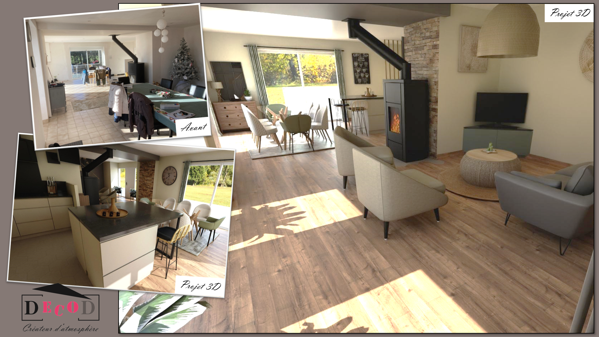 Projet de rénovation d’une pièce de vie (2022) – Ces clients avaient pour projet d’unifier la cuisine, le salon et la salle à manger. Ayant du mal à imaginer les volumes et la décoration de la pièce après démolition, ils ont fait appel à DecoD pour leur faire des vues en 3D.
