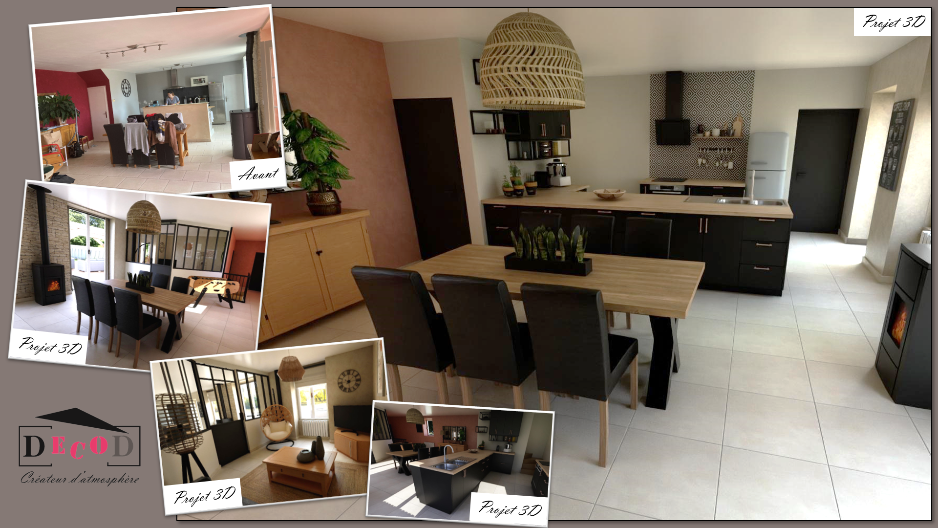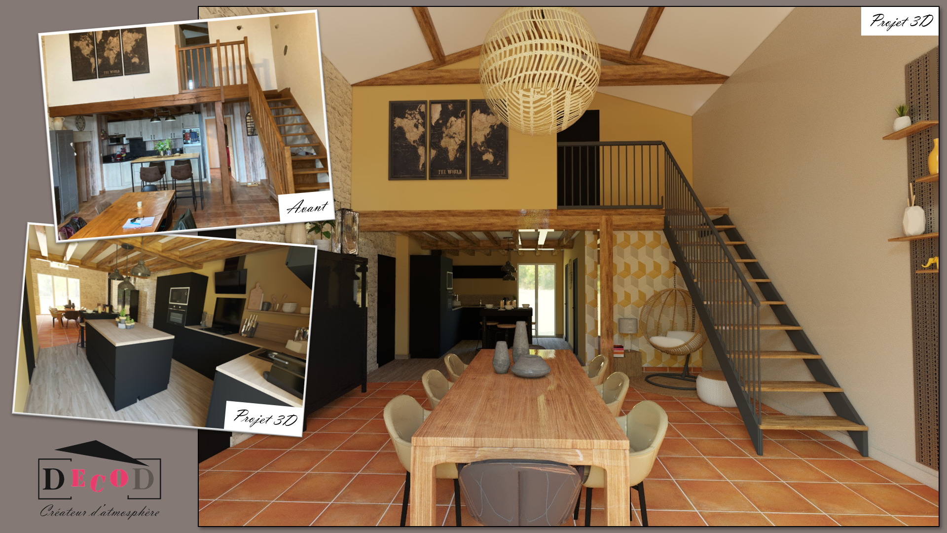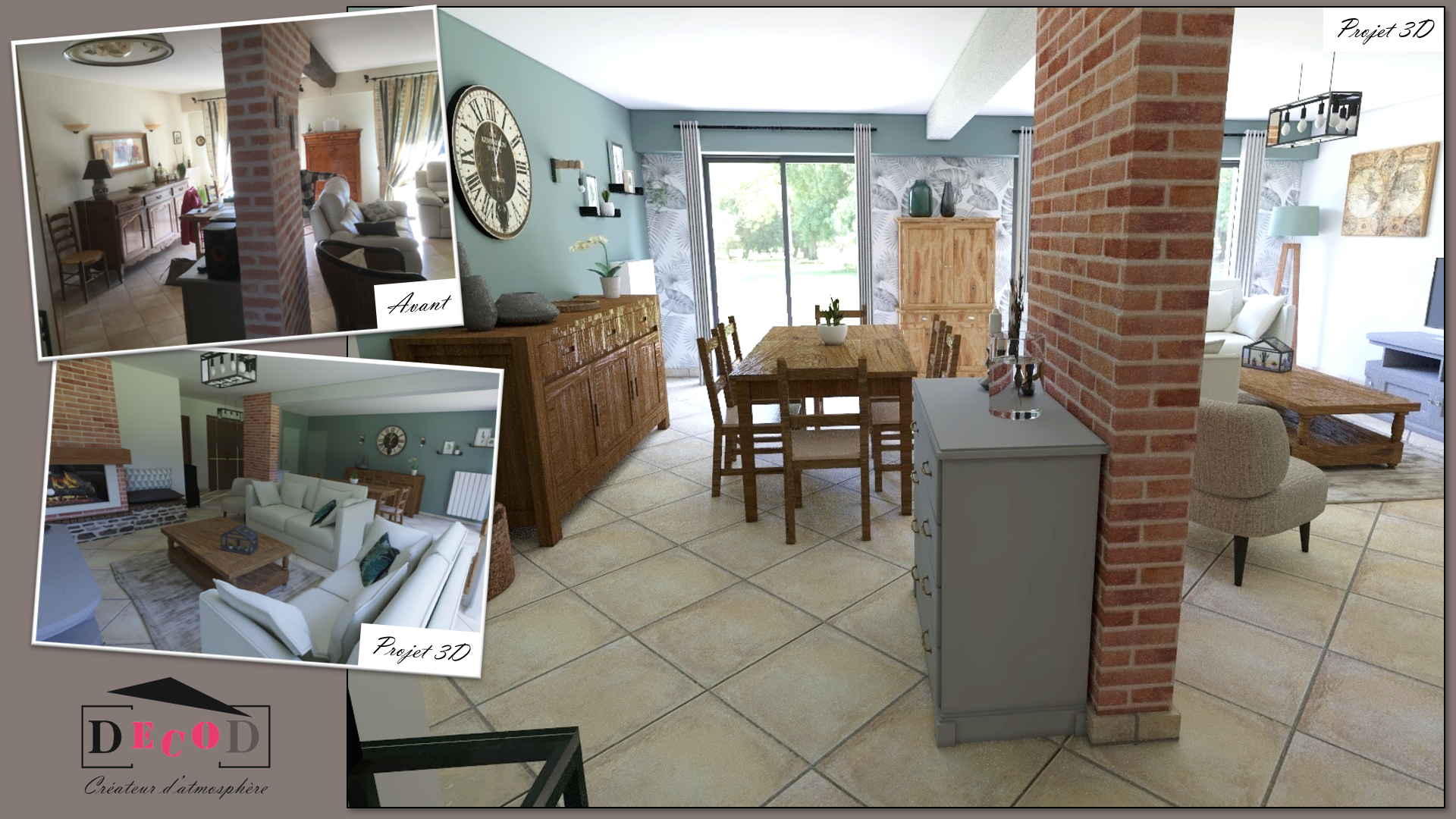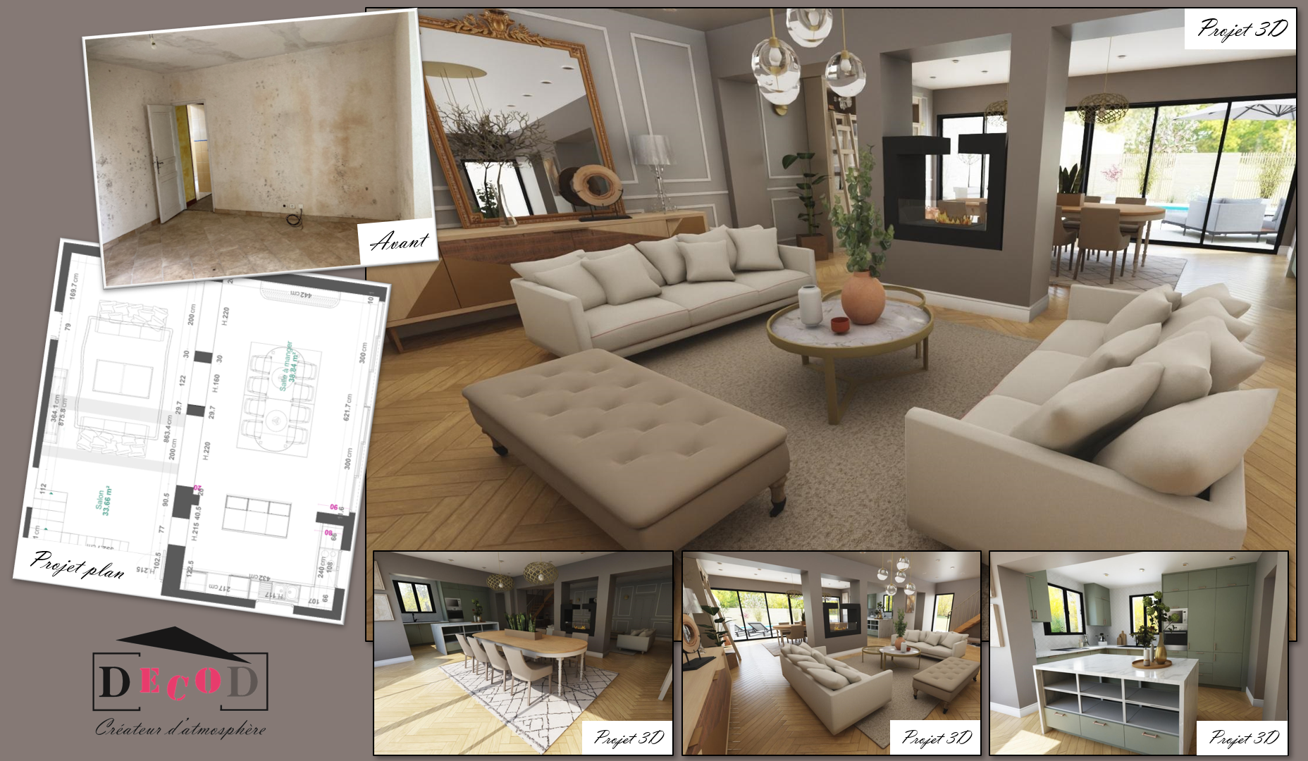 Projet de rénovation d’une pièce de vie (2022) – Ces clients avaient pour projet d’unifier la cuisine, le salon et la salle à manger. Ayant du mal à imaginer les volumes et la décoration de la pièce après démolition, ils ont fait appel à DecoD pour leur faire des vues en 3D.