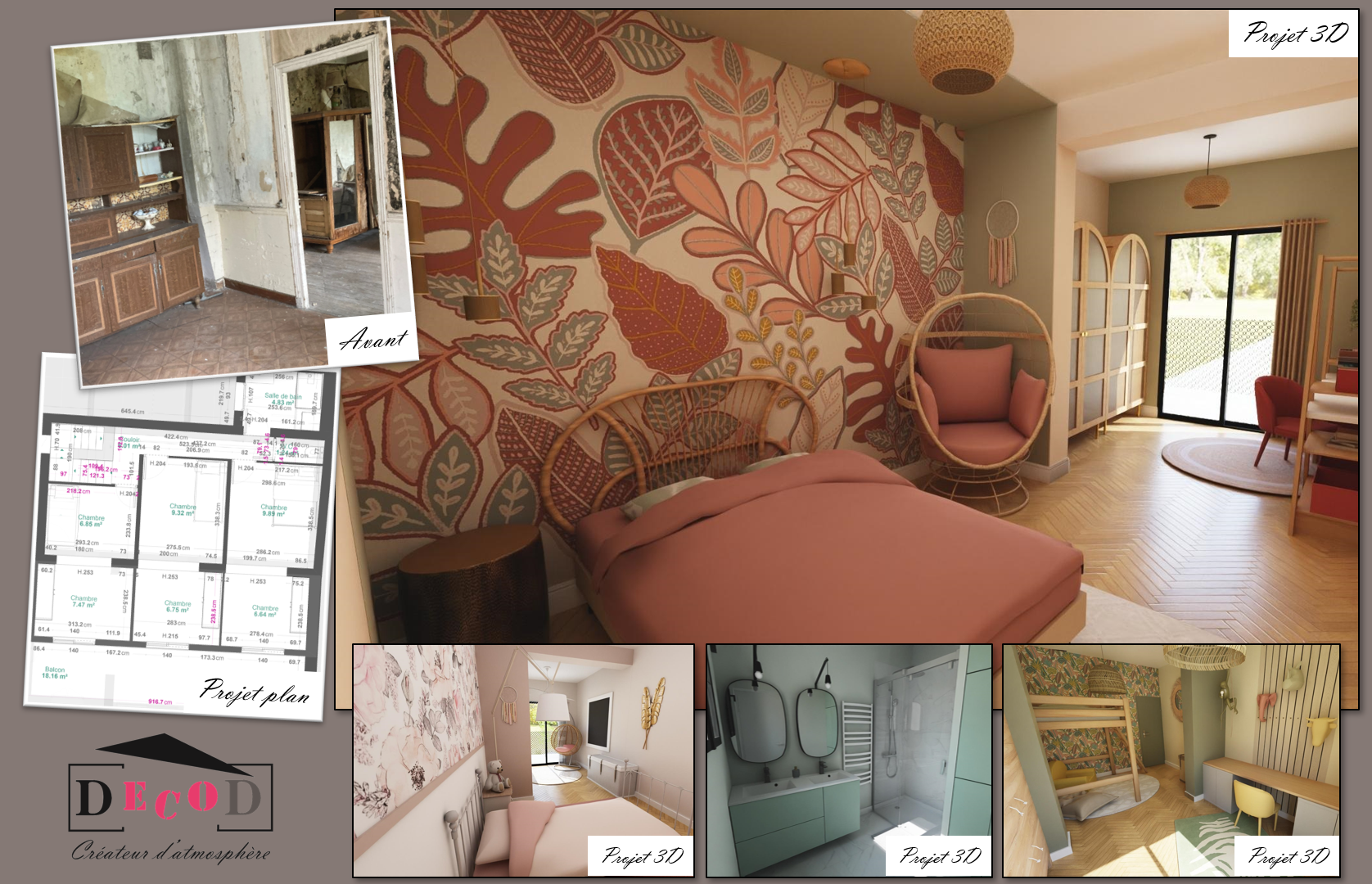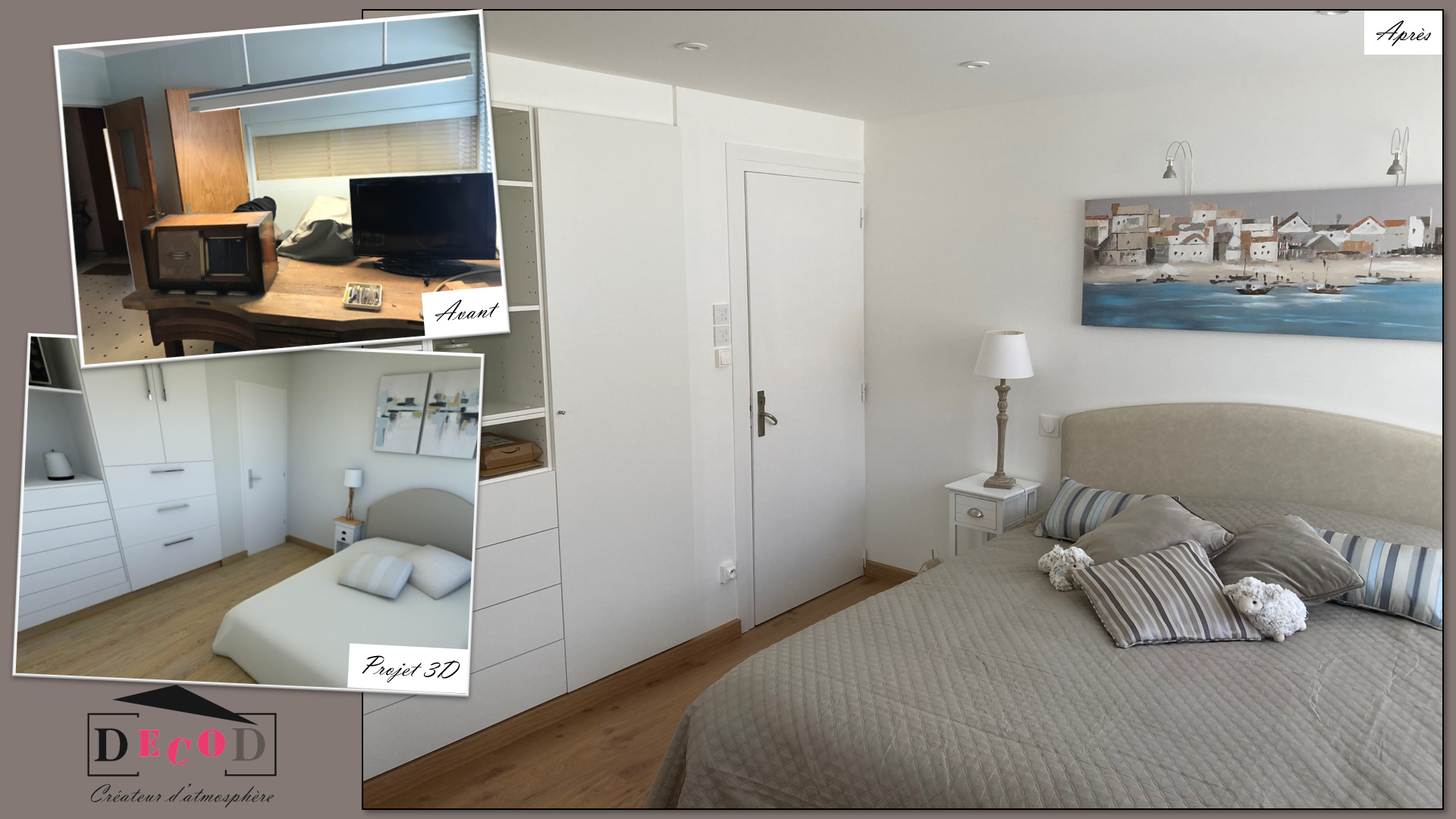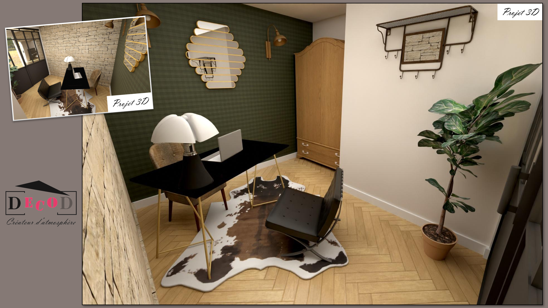 Transformation d’un bureau en chambre (2021) – DecoD a été contacté par cette cliente qui souhaitait transformer un bureau en chambre. Grâce à des vues 3D, elle a pu se projeter et diligenter les travaux.