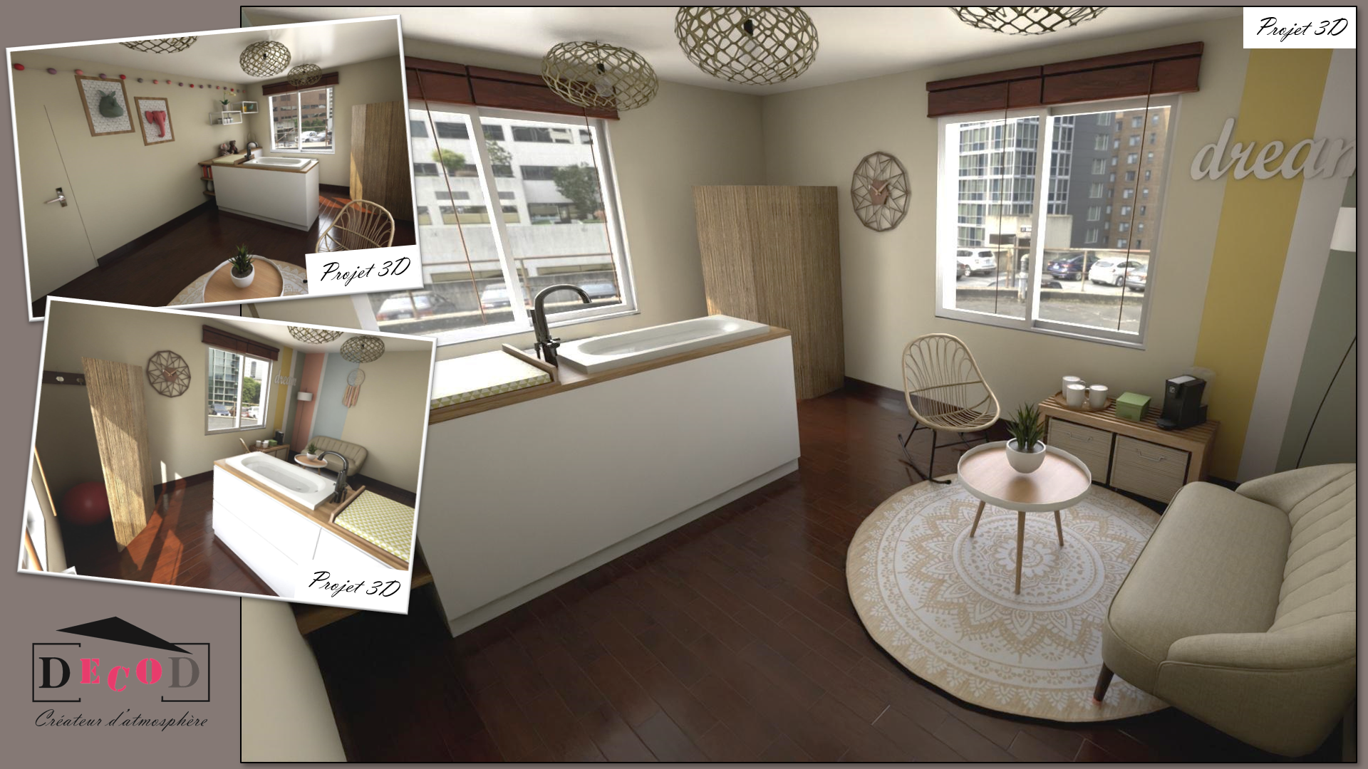 Plan et vues 3D avant rénovation complète (2022) – Ces clients ont acheté un appartement à rénover. Afin de les aider à se projeter et à établir leurs devis auprès des artisans, ils ont fait appel à DecoD pour imaginer le futur agencement et la décoration grâce à un plan et des vues 3D photoréalistes sous différents angles.
