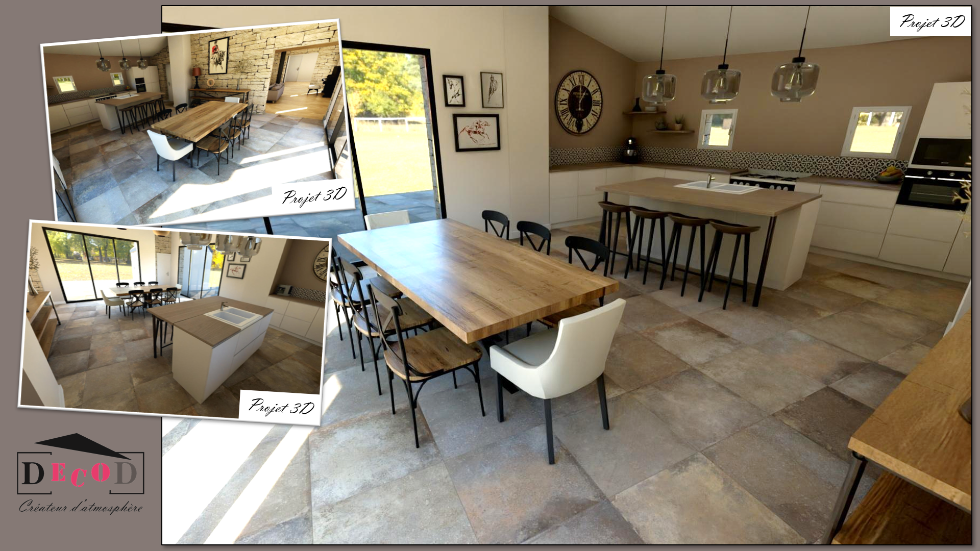 Projet d’aménagement d’une pièce de vie (2022) – Ce client avait achevé le gros oeuvre sur sa maison mais ne parvenait pas à la décorer. Il a donc contacté DecoD pour l’y aider. Julie a conçu un projet d’aménagement de la cuisine et de décoration de la pièce de vie, retranscrit sur des vues 3D.