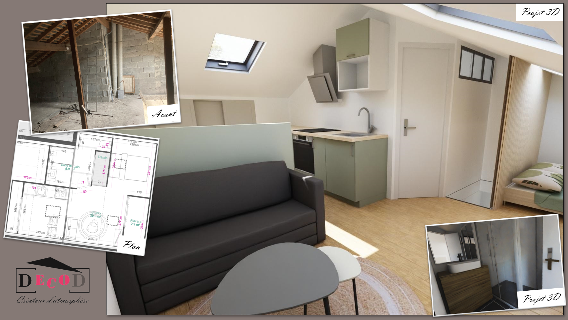 Projet de studio sous les combles (2024) – Ce client avait pour projet de réaliser un locatif sous les combles. Il a demandé à DecoD d’imaginer l’agencement d’un studio afin d’optimiser au mieux les mètres carrés.