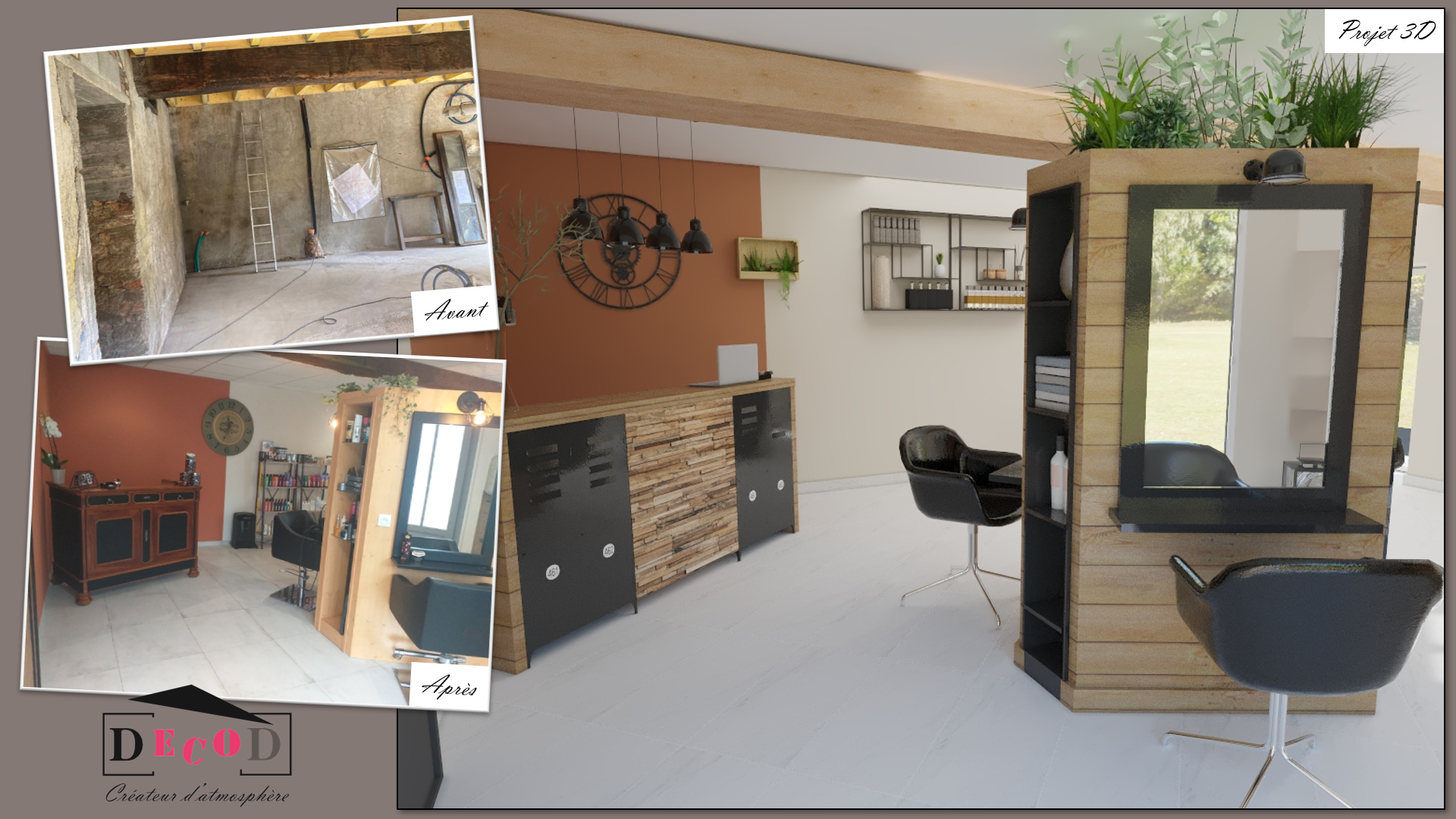Création d’un salon de coiffure (2021) – Dans le cadre de la création d’un salon de coiffure, DecoD a imaginé un agencement et une décoration, retranscrits sur des vues 3D. Grâce à ces projections photoréalistes, les artisans ont pu réaliser les travaux.