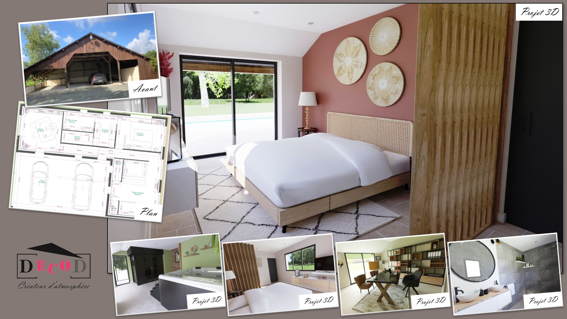 Projet d’aménagement d’une grange (2021) – Ces clients ont fait appel à DecoD pour réaliser un projet d’aménagement d’une grange en suite parentale tout confort. Grâce à un plan et des vues 3D, ils ont pu visualiser les volumes et la décoration envisagés pour chaque espace!
