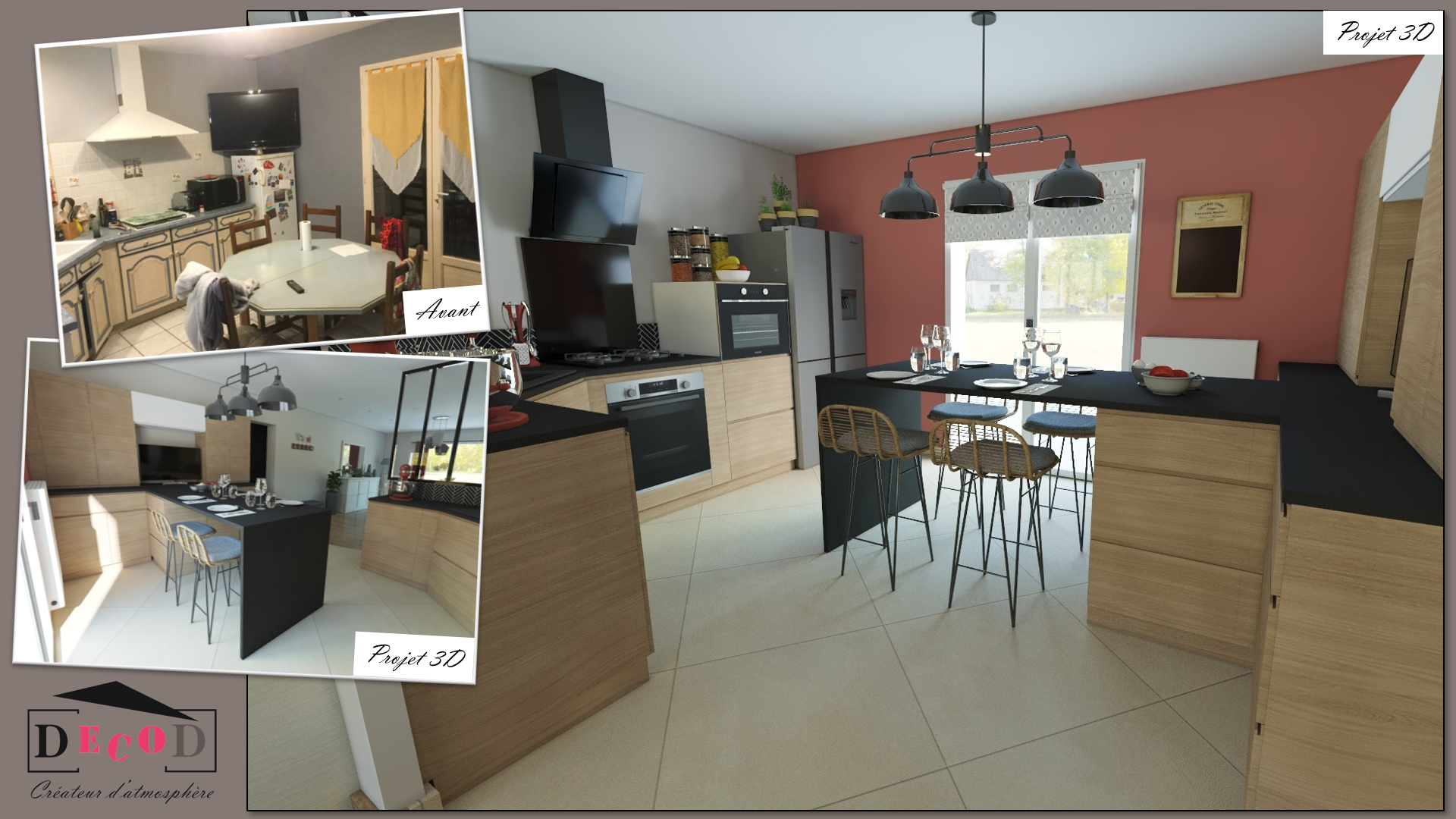 Projet de relooking d’une pièce de vie (2021) – Ces clients voulaient réagencer leur cuisine et apporter une légère touche de modernité à leur pièce de vie. Ils ont sollicité DecoD pour des conseils en aménagement et des vues 3D
