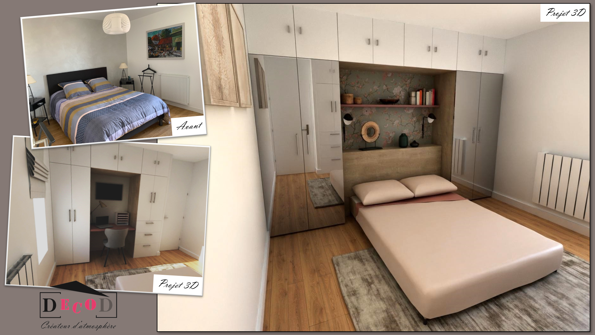 Projet d’aménagement d’une chambre (2022) – DecoD a été contacté par cette cliente qui manquait de rangements et d’un coin bureau dans sa chambre. Grâce à des vues 3D, elle a pu se projeter et diligenter les travaux.