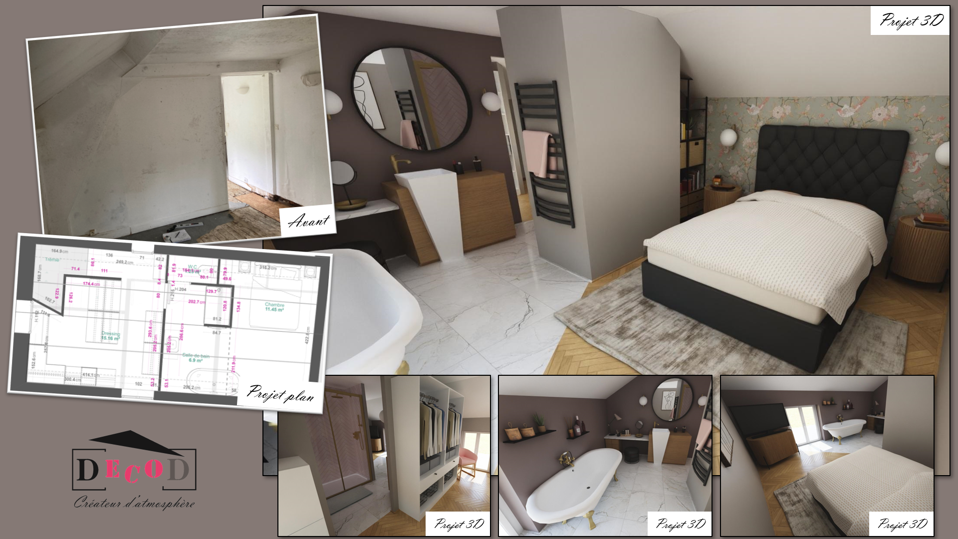 Projet de création d’une suite parentale (2023) – Des clients en auto rénovation ont fait appel aux services de DecoD pour imaginer l’agencement et la décoration de leur suite parentale.