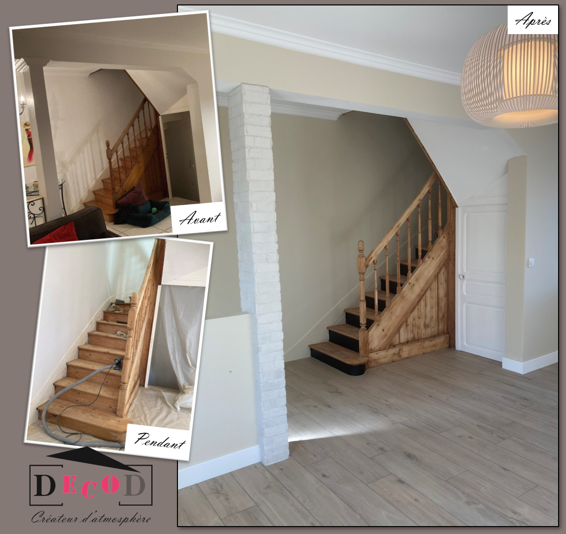 Relooking d’un escalier dans le cadre d’une rénovation globale (2023) – Ces clients ont fait appel à DecoD pour imaginer leur future pièce de vie et en gérer les travaux de rénovation.