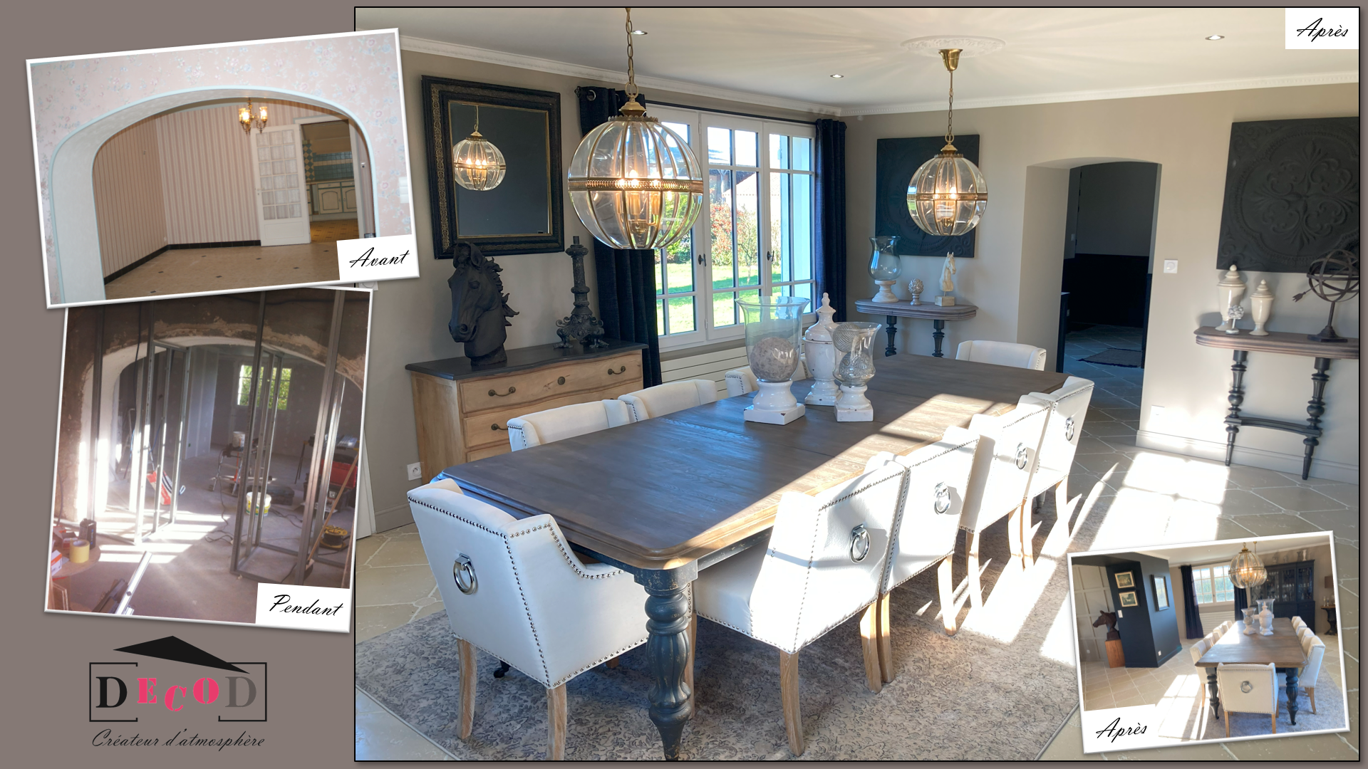 Rénovation d’une salle à manger (2014) – A l’occasion d’une rénovation complète, DecoD a repensé les volumes de cette maison et réalisé les travaux (démolition, placo, isolation, bandes, peinture, pose des moulures, décoration).
