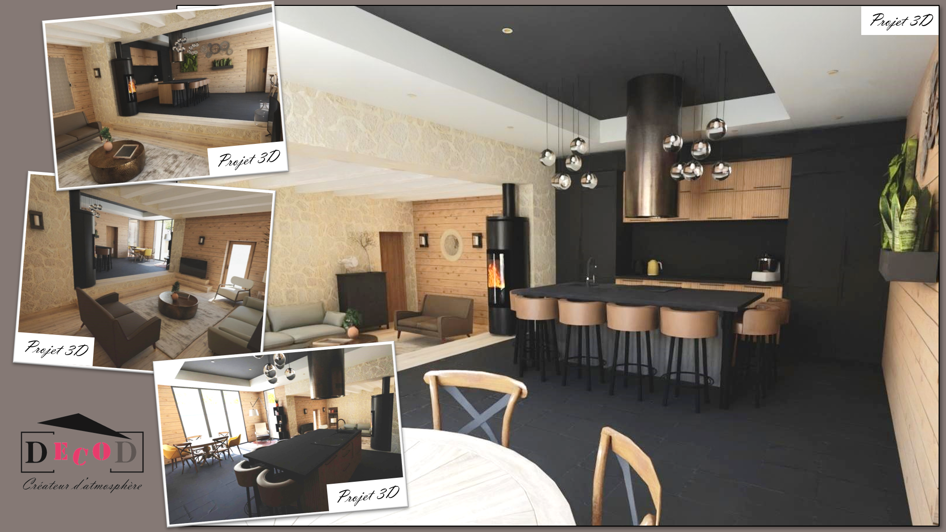 Projet de rénovation d’une pièce de vie (2022) – Ces clients voulaient refaire leur cuisine et séparer leur coin salon du reste de leur pièce de vie. Ils ont donc fait appel à DecoD pour leur imaginer le projet et leur présenter en 3D.